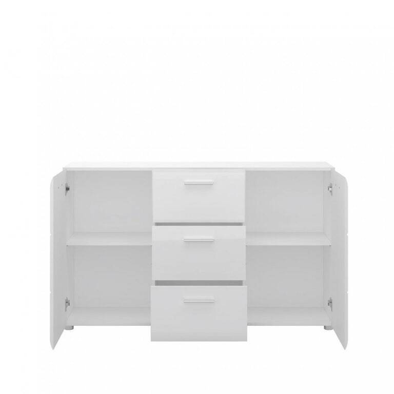 „Merano MEOK01“ yra elegancijos ir minimalizmo sinonimas, pasireiškiantis tiek paprasta forma, tiek nepriekaištinga balta apdaila. Jos gamyboje naudojamos patvarios laminato plokštės ir MDF plokštės, todėl šis baldas yra labai atsparus kasdieniam naudojimui. Ryškiai baltos blizgios MDF fasadai ne tik suteikia komodai modernumo, bet ir leidžia ją lengvai prižiūrėti, o tai neįkainojama dažnai naudojamiems baldams.