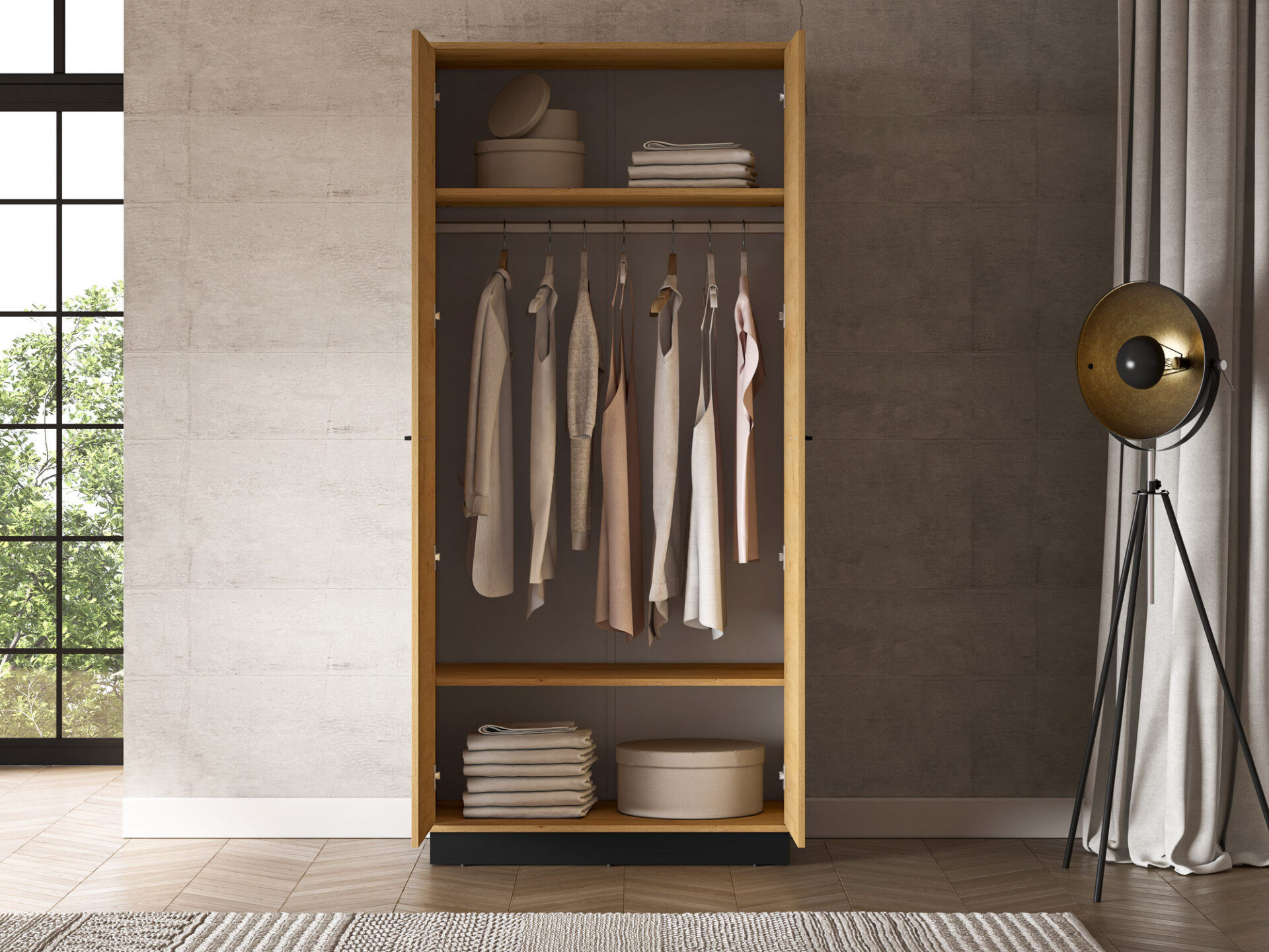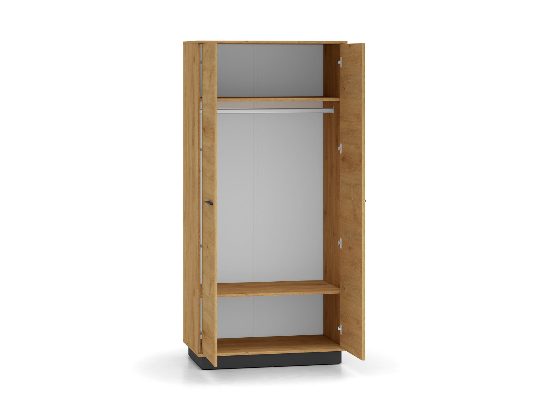 Dviejų durų „Modesto 01“ spinta – puikus sprendimas drabužiams, aksesuarams ir kitiems namų tekstilės gaminiams laikyti. Dėl tvirto bėgelio, einančio per visą spintos plotį, galite pakabinti paltus, kostiumėlius ar sukneles. Didelė viršutinės ir apatinės lentynų talpa taip pat leis jums susidėti patalynę ar rankšluosčius. Paprastas stilius, universalus patrauklumas, didelis funkcionalumas ir aukštos kokybės „Modesto 01“ spinta pateisins visus jūsų lūkesčius.
