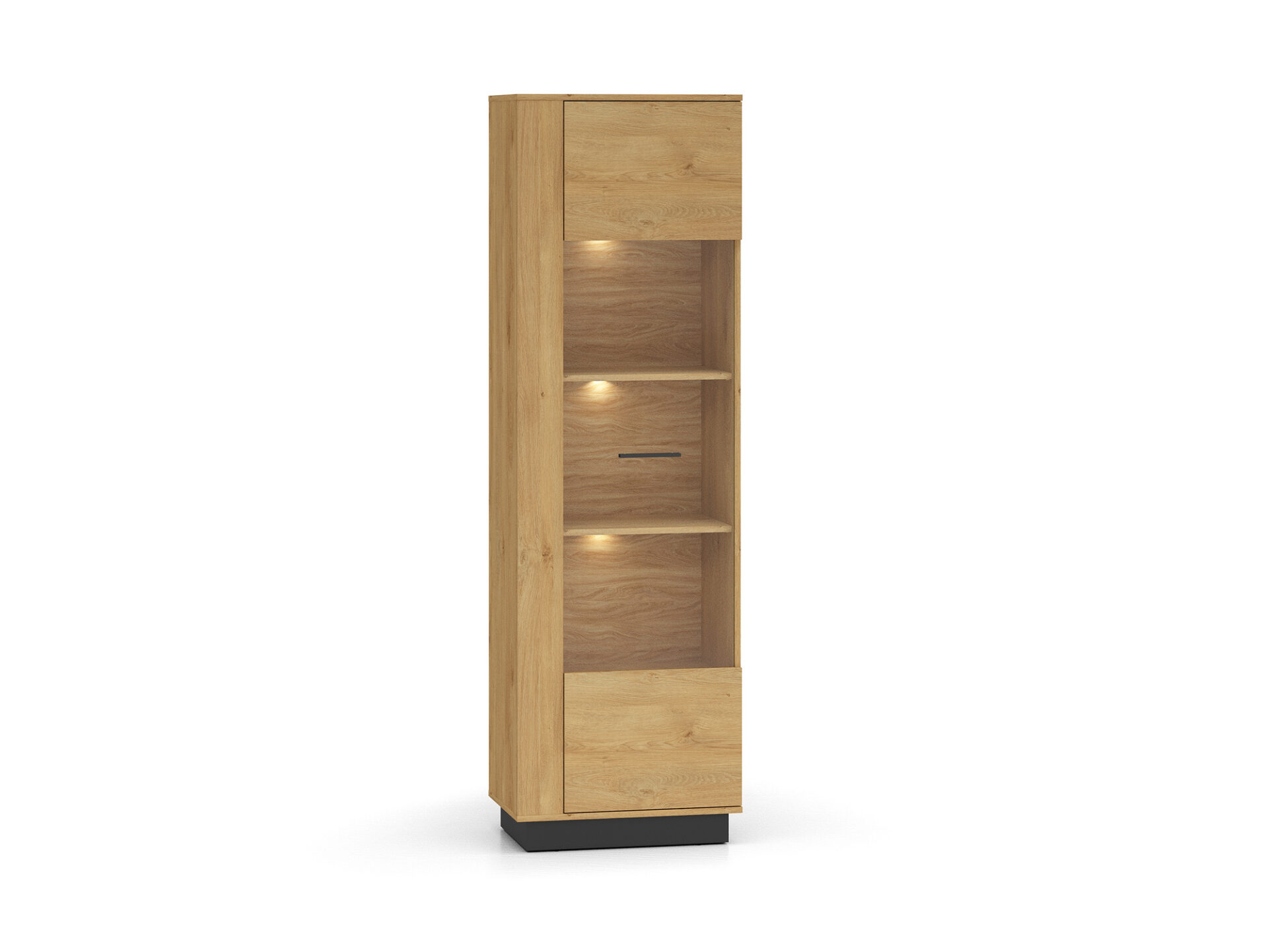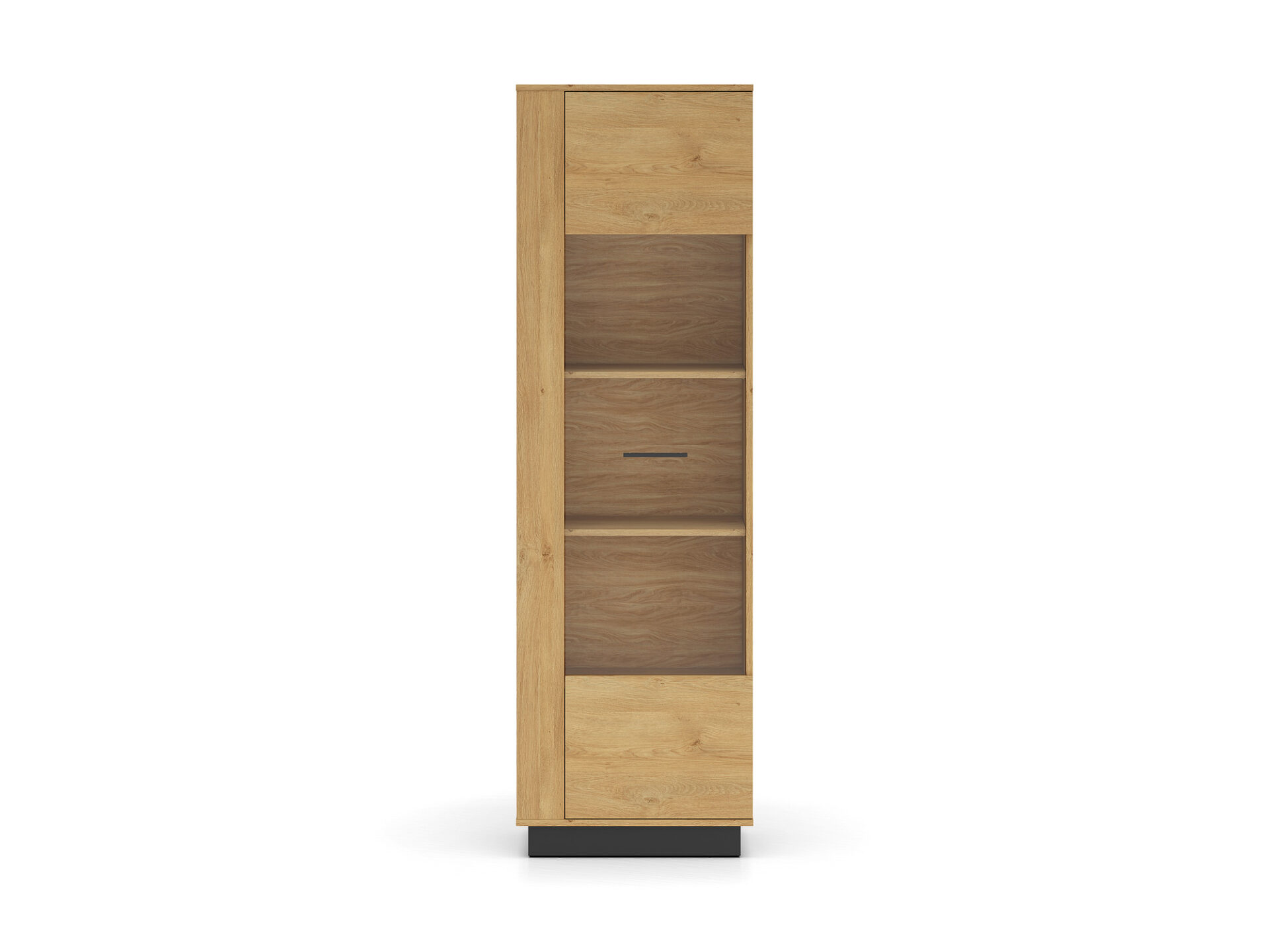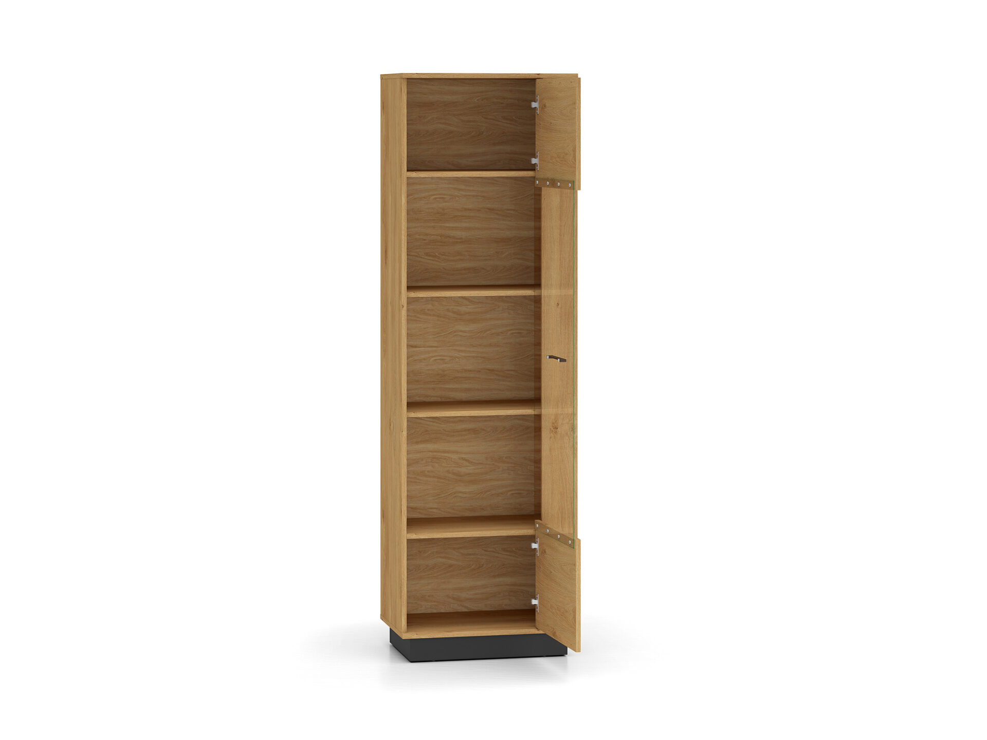 Aukšta vitrina „Modesto 02“ – tai baldas, leidžiantis jums eksponuoti mėgstamiausius daiktus. Dvi tvirtos lentynos padalija erdvę už stiklinių durelių į tris nišas. Joje galite eksponuoti taures, porceliano kolekciją ar suvenyrus iš kelionių. Jei norite dar labiau išryškinti savo mėgstamiausius daiktus, rinkitės mūsų LED apšvietimą. Spintelės sklindanti šviesa subtiliai sušildys visą jūsų interjerą. Apatinėje spintelės dalyje yra dvi paslėptos lentynos, puikiai tinkančios stalo įrankiams ar staltiesėms laikyti. Paprastas stilius, universalus patrauklumas, didelis funkcionalumas ir aukštos kokybės „Modesto 02“ spintelė pateisins visus jūsų lūkesčius.