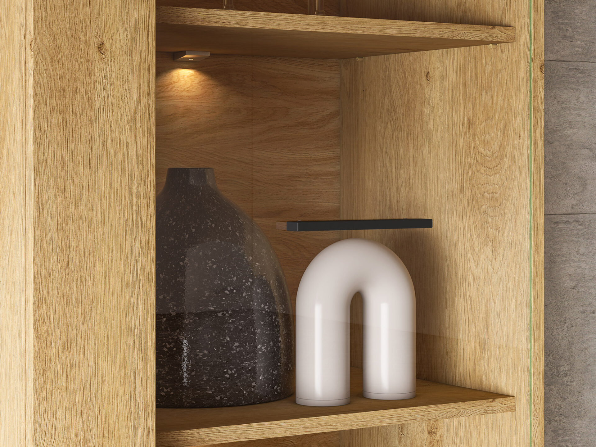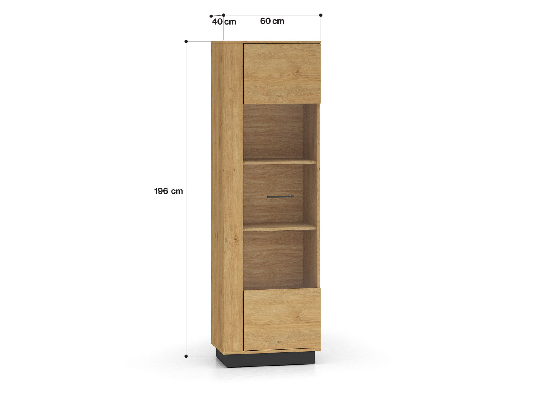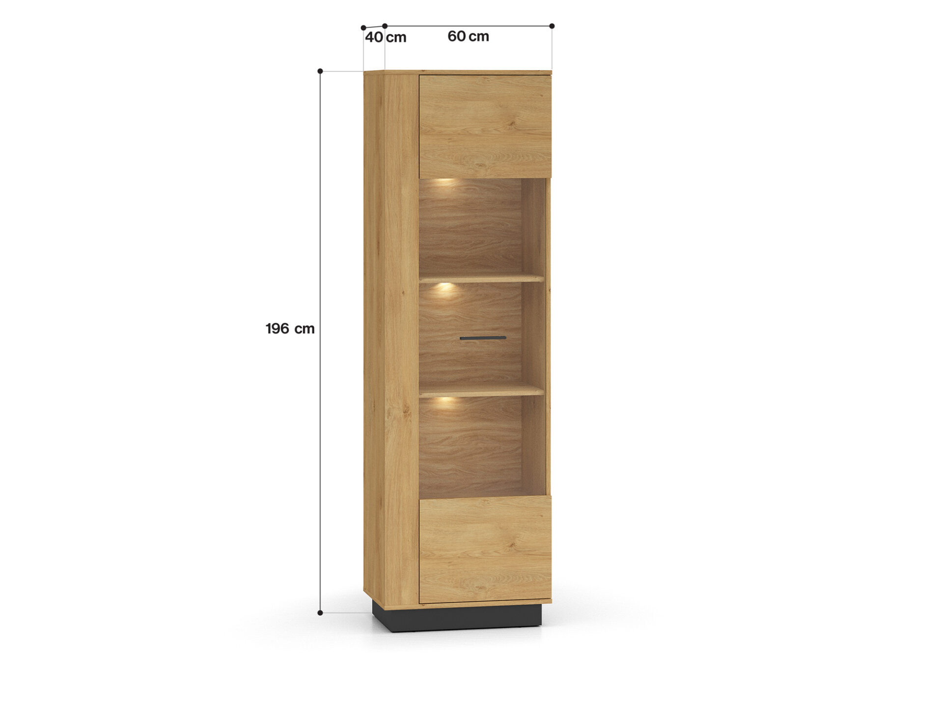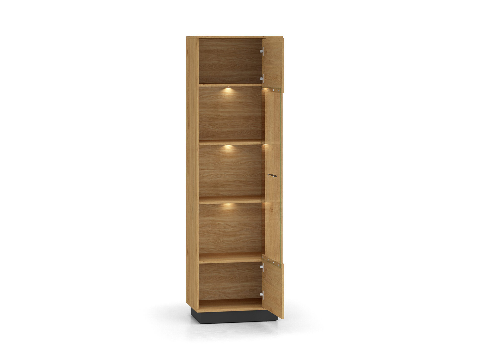 Aukšta vitrina „Modesto 02“ – tai baldas, leidžiantis jums eksponuoti mėgstamiausius daiktus. Dvi tvirtos lentynos padalija erdvę už stiklinių durelių į tris nišas. Joje galite eksponuoti taures, porceliano kolekciją ar suvenyrus iš kelionių. Jei norite dar labiau išryškinti savo mėgstamiausius daiktus, rinkitės mūsų LED apšvietimą. Spintelės sklindanti šviesa subtiliai sušildys visą jūsų interjerą. Apatinėje spintelės dalyje yra dvi paslėptos lentynos, puikiai tinkančios stalo įrankiams ar staltiesėms laikyti. Paprastas stilius, universalus patrauklumas, didelis funkcionalumas ir aukštos kokybės „Modesto 02“ spintelė pateisins visus jūsų lūkesčius.