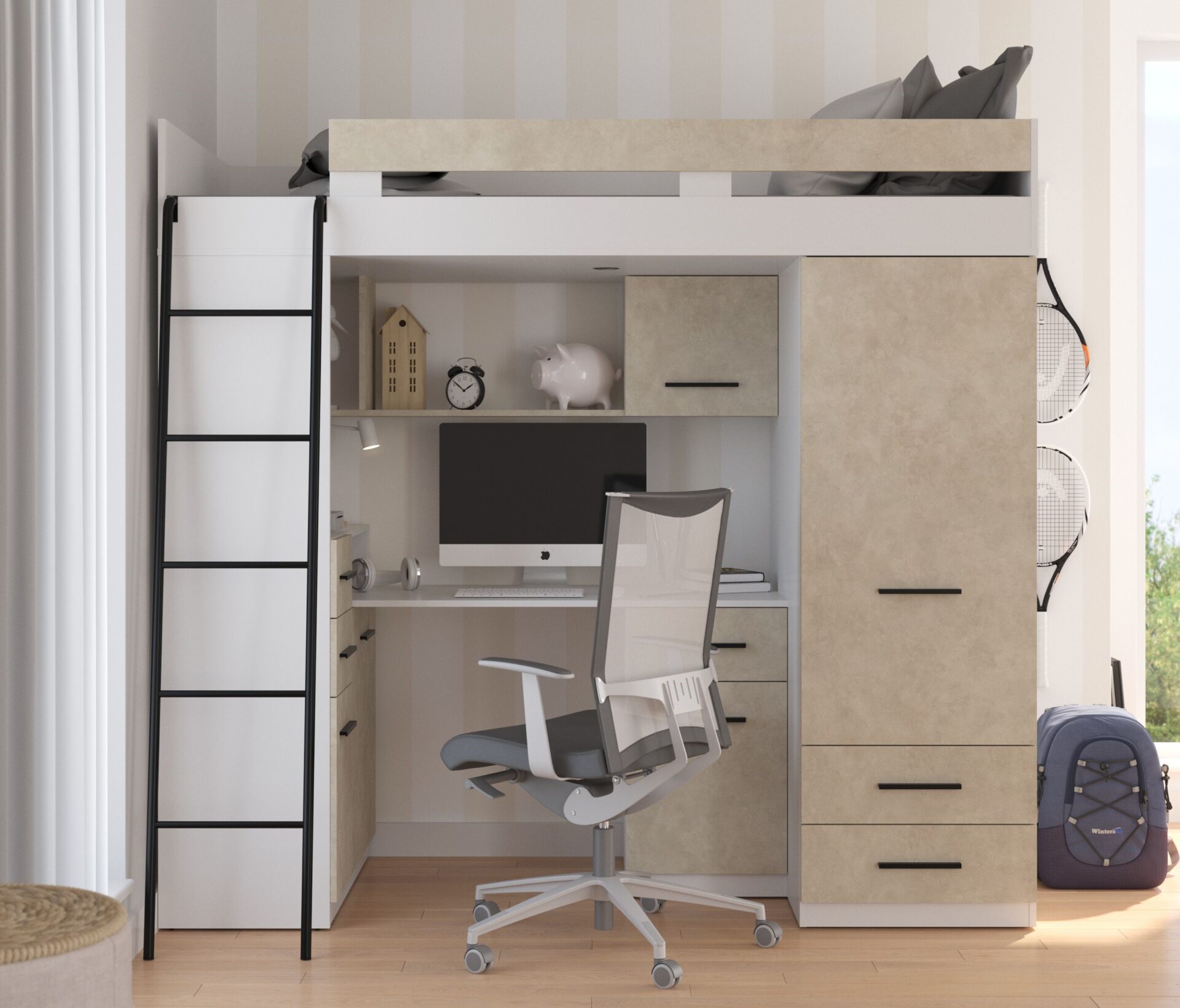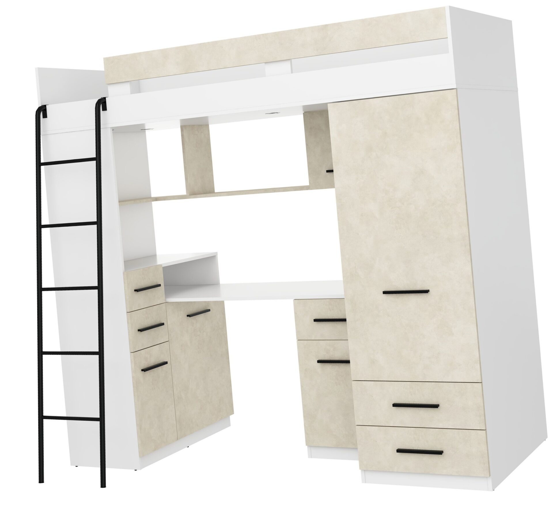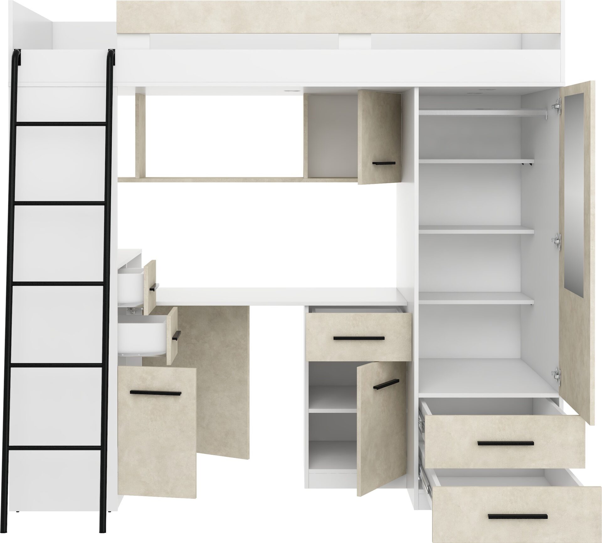 MYKS L antresolė be čiužinio. 16 mm plokštė, ABS kraštas, švelniai užsidarantys stalčiai ir spintelės. Spalva: balta / granados migdolų spalvos.