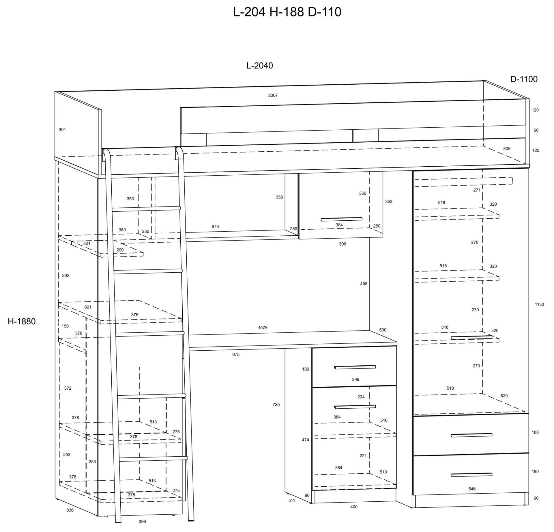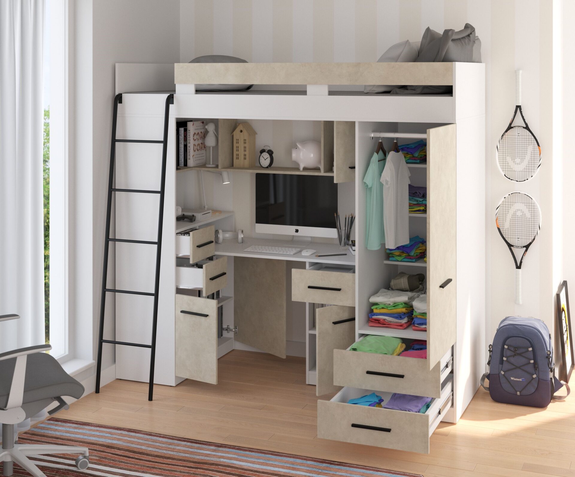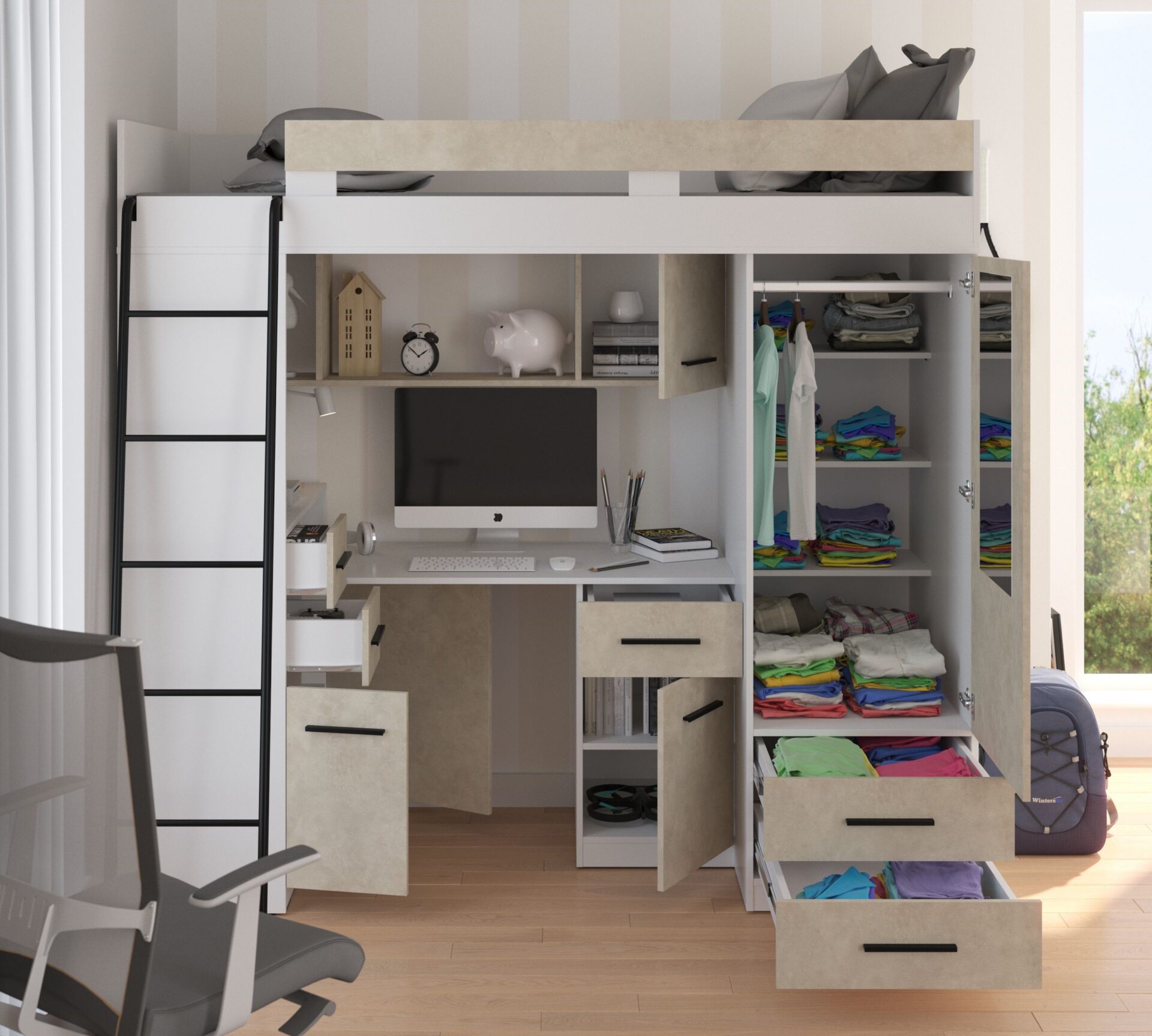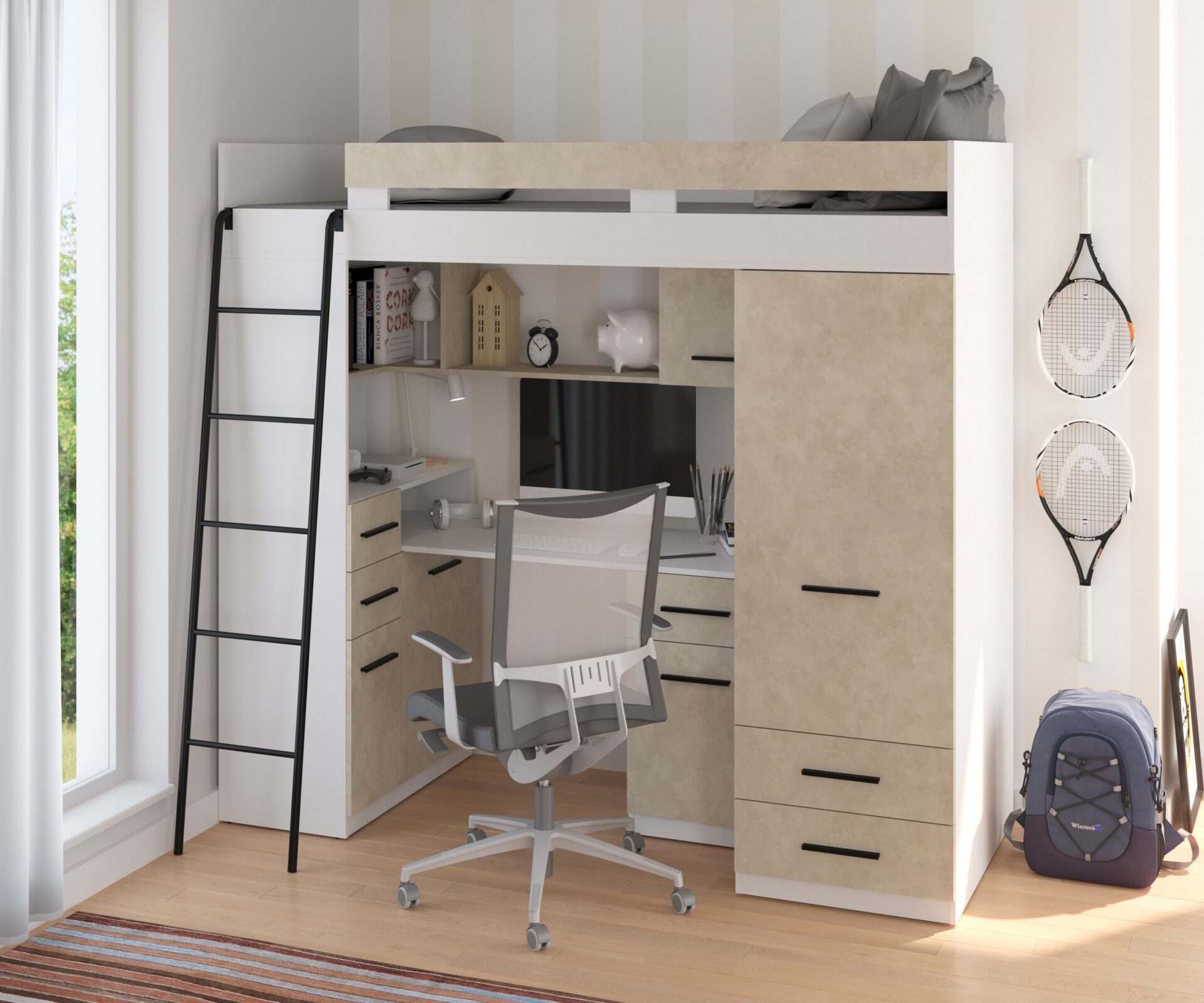 MYKS L antresolė be čiužinio. 16 mm plokštė, ABS kraštas, švelniai užsidarantys stalčiai ir spintelės. Spalva: balta / granados migdolų spalvos.