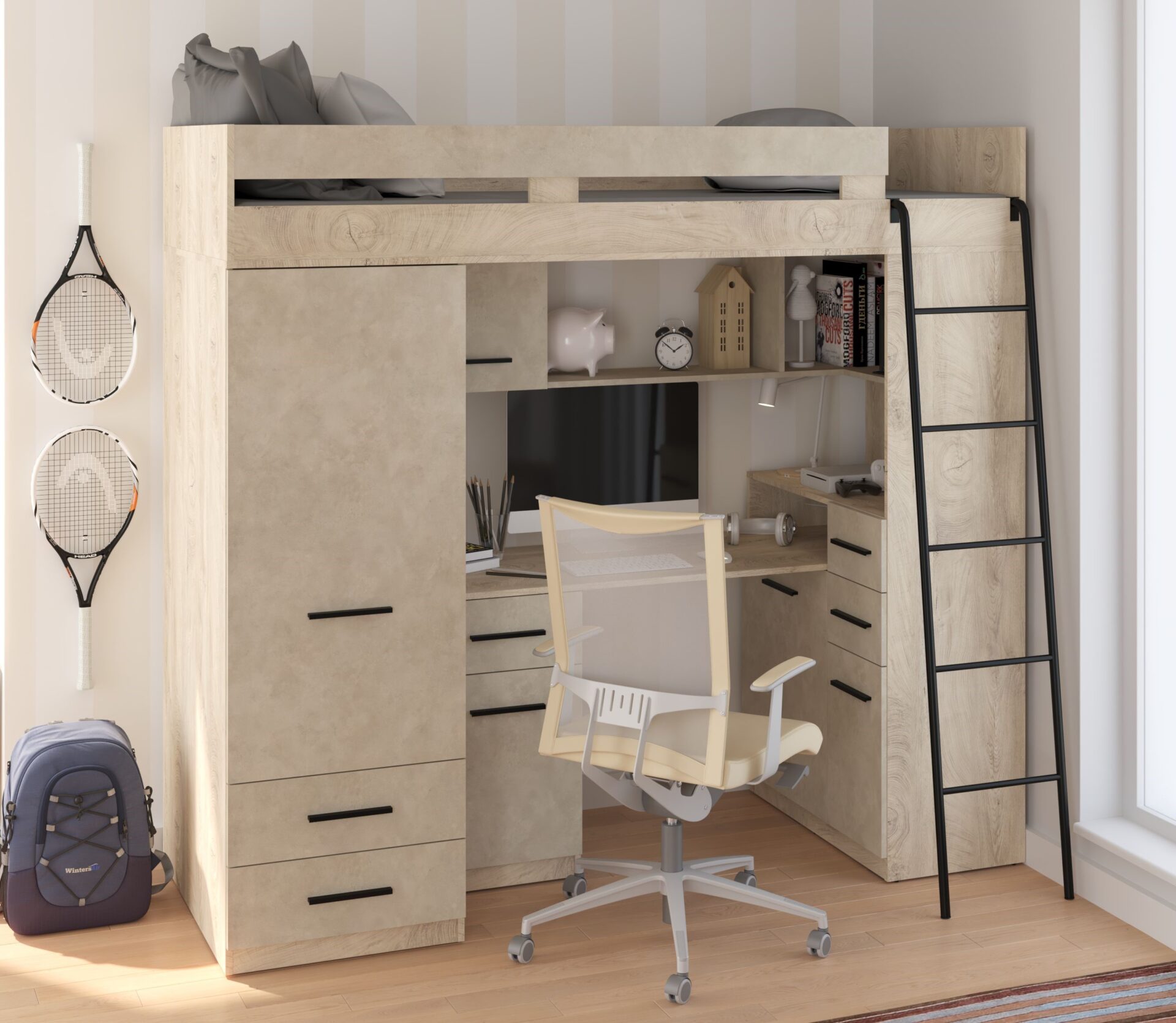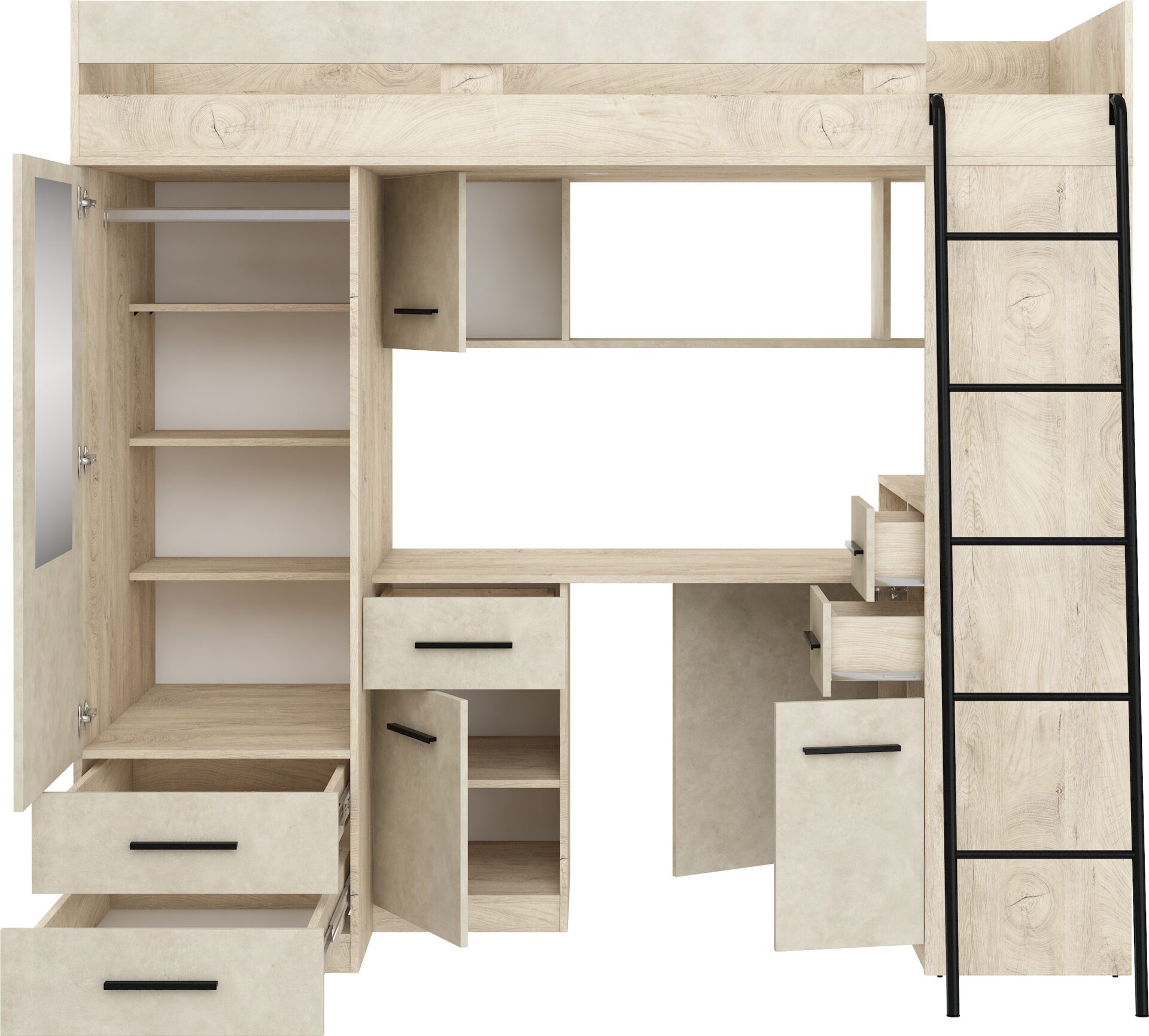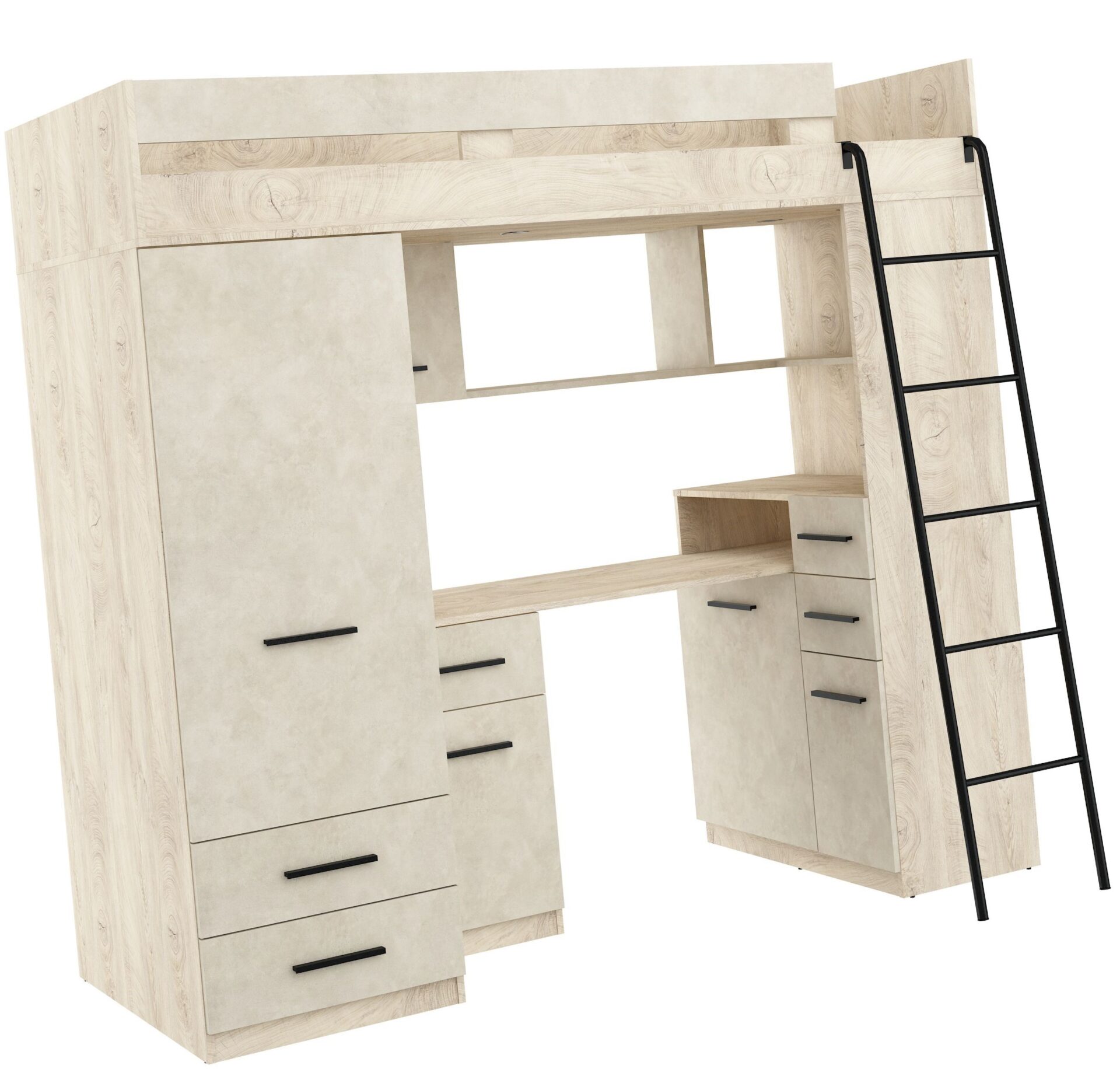 MYKS P antresolė be čiužinio. 16 mm plokštė, ABS kraštas, švelniai užsidarantys stalčiai ir spintelės. Spalva: ąžuolo imitacija / granados migdolų imitacija.