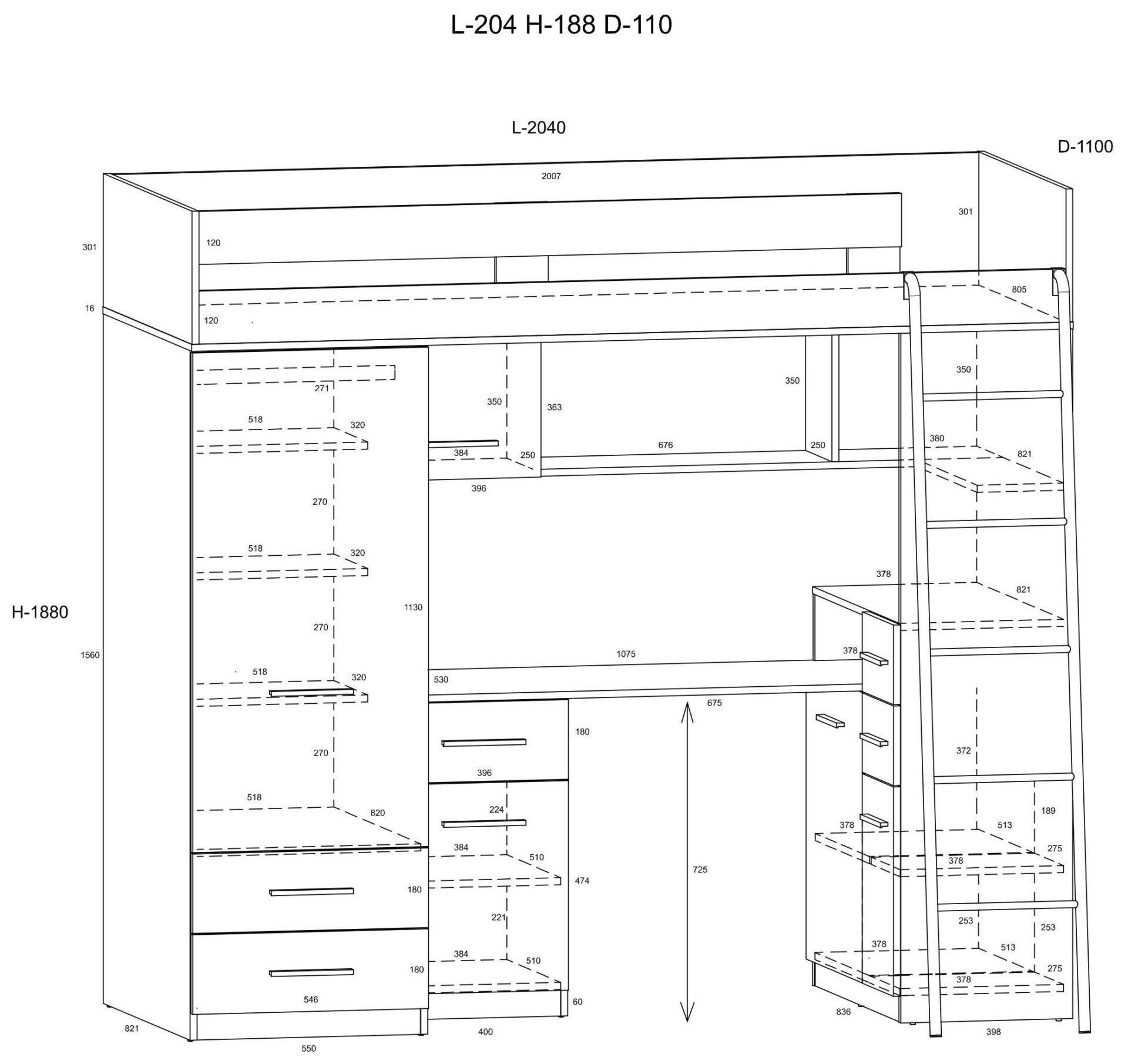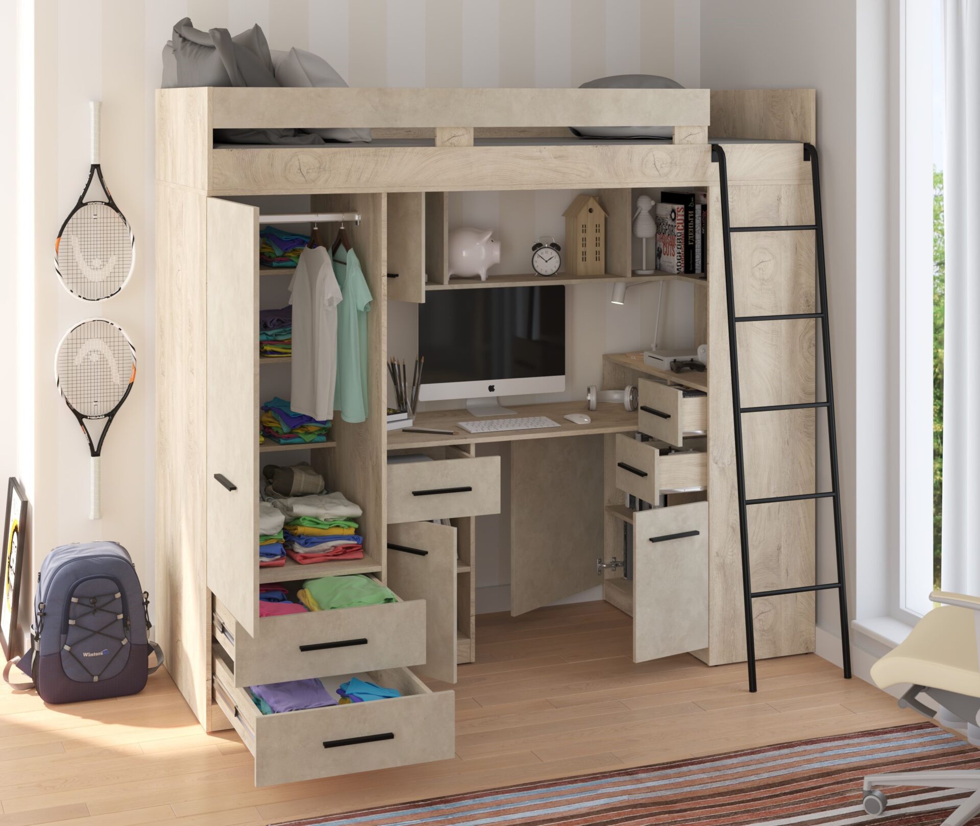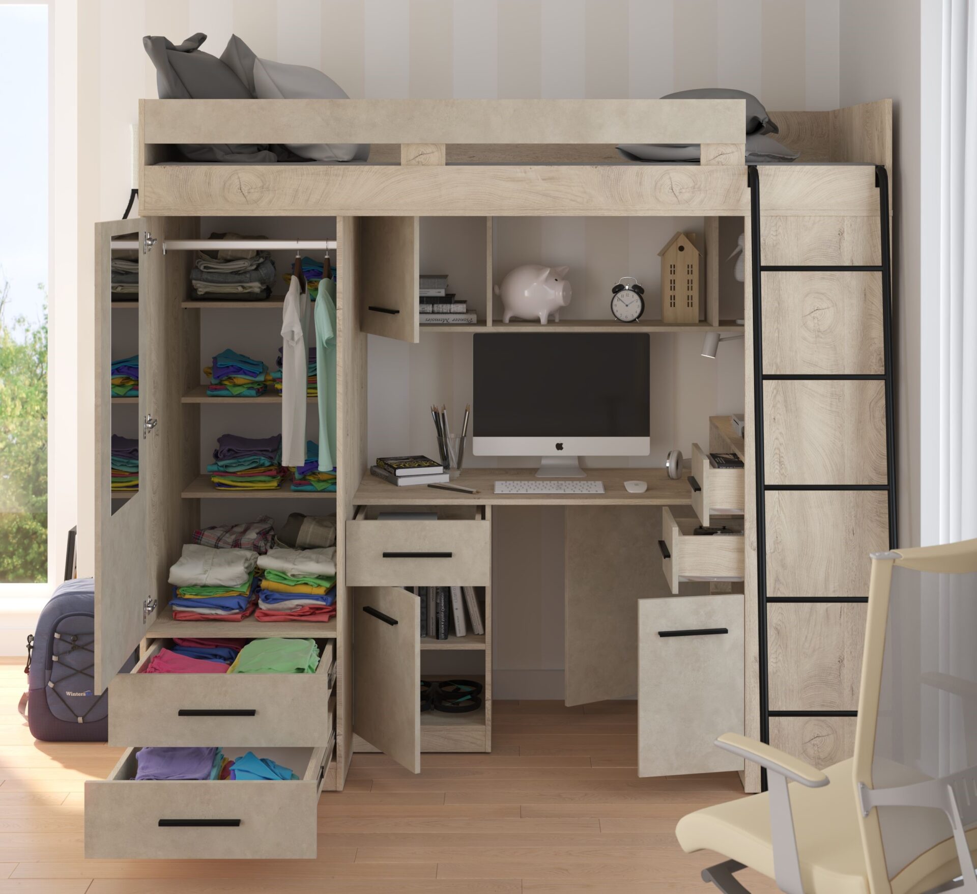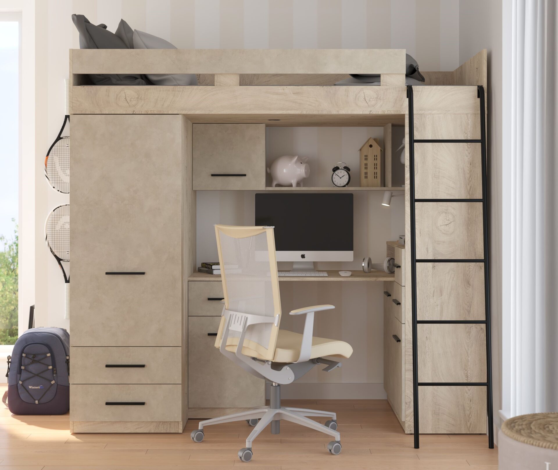 MYKS P antresolė be čiužinio. 16 mm plokštė, ABS kraštas, švelniai užsidarantys stalčiai ir spintelės. Spalva: ąžuolo imitacija / granados migdolų imitacija.