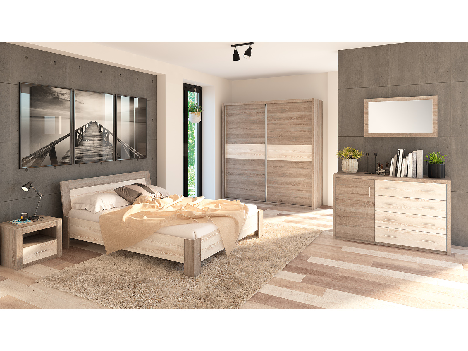 Šį miegamojo baldų komplektą sudaro lova, spinta, komoda ir naktiniai staleliai. Juos taip pat galima įsigyti atskirai, todėl galite susikurti savo miegamojo baldų komplektą pagal savo individualius pageidavimus. Jie yra patogūs ir erdvūs dėl gerai suprojektuotų daiktadėžių. Dėl aukščiausios kokybės meistriškumo jais galėsite džiaugtis ilgus metus. Komplektą sudaro: