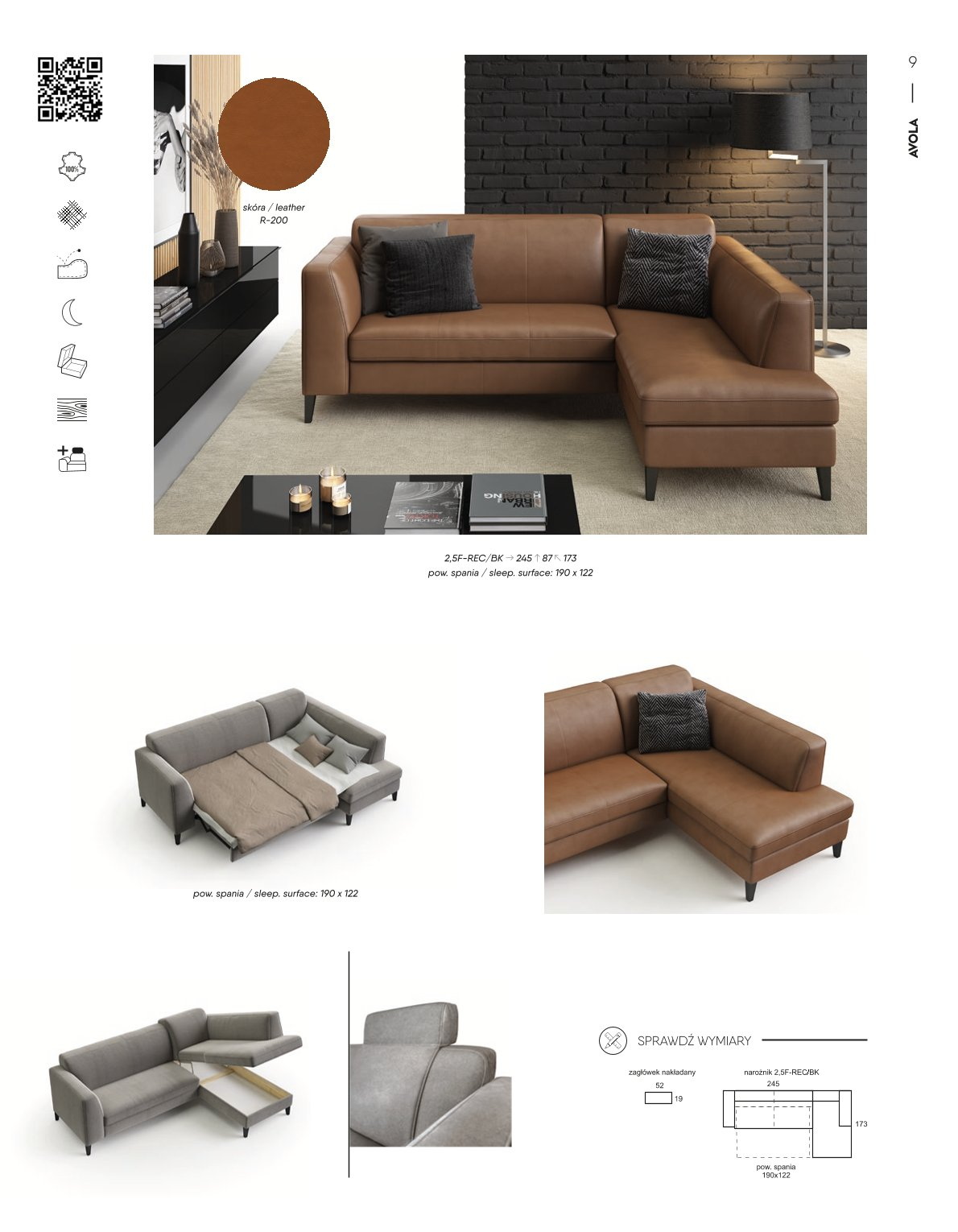 Klientai gali pasirinkti apmušalų tipą ir spalvą, įskaitant platų audinių ir odų asortimentą, suteikdami jiems laisvę papildyti kampinės sofos išvaizdą savo svetainės dekoru. „Avola 2.5F-REC/BK“ – tai kruopščiai pagamintas baldas, kurio techniniai parametrai ir apgalvoti sprendimai leidžia jį naudoti tiek kasdieniam poilsiui, tiek retkarčiais apsistojantiems svečiams.