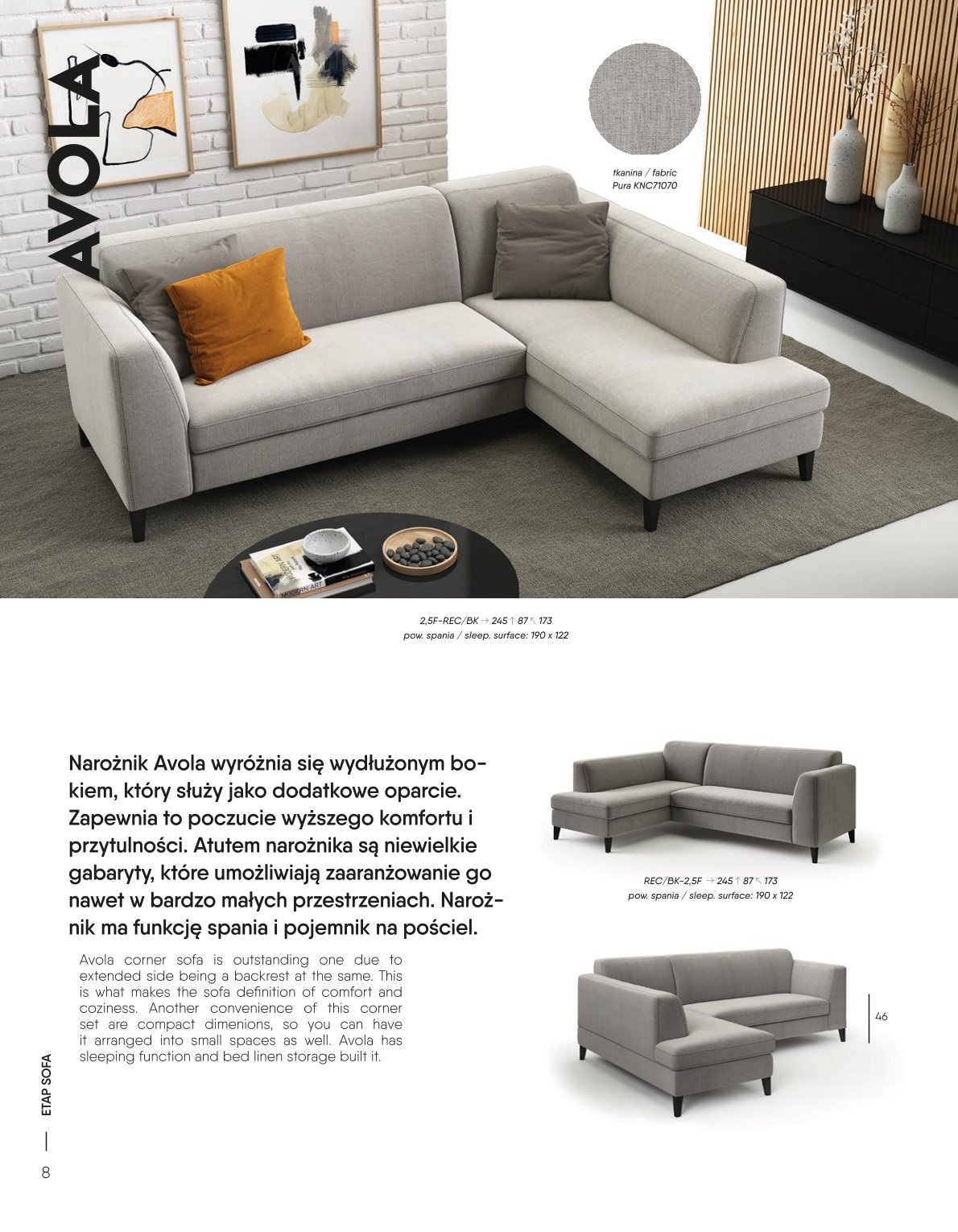 Moderni „Avola 2.5F-REC/BK Etap Sofa“ kampinė sofa puikiai tinka ieškantiems kompaktiškos, bet patogios sofos. 245 cm pločio, 87 cm aukščio ir 173 cm gylio sofa lengvai telpa net mažesnėse erdvėse, išlaikant patogią sėdėjimo zoną. Modelis tiekiamas kairės ir dešinės pusės (L/R) versijomis, todėl jį lengva pritaikyti prie bet kokio kambario išplanavimo.