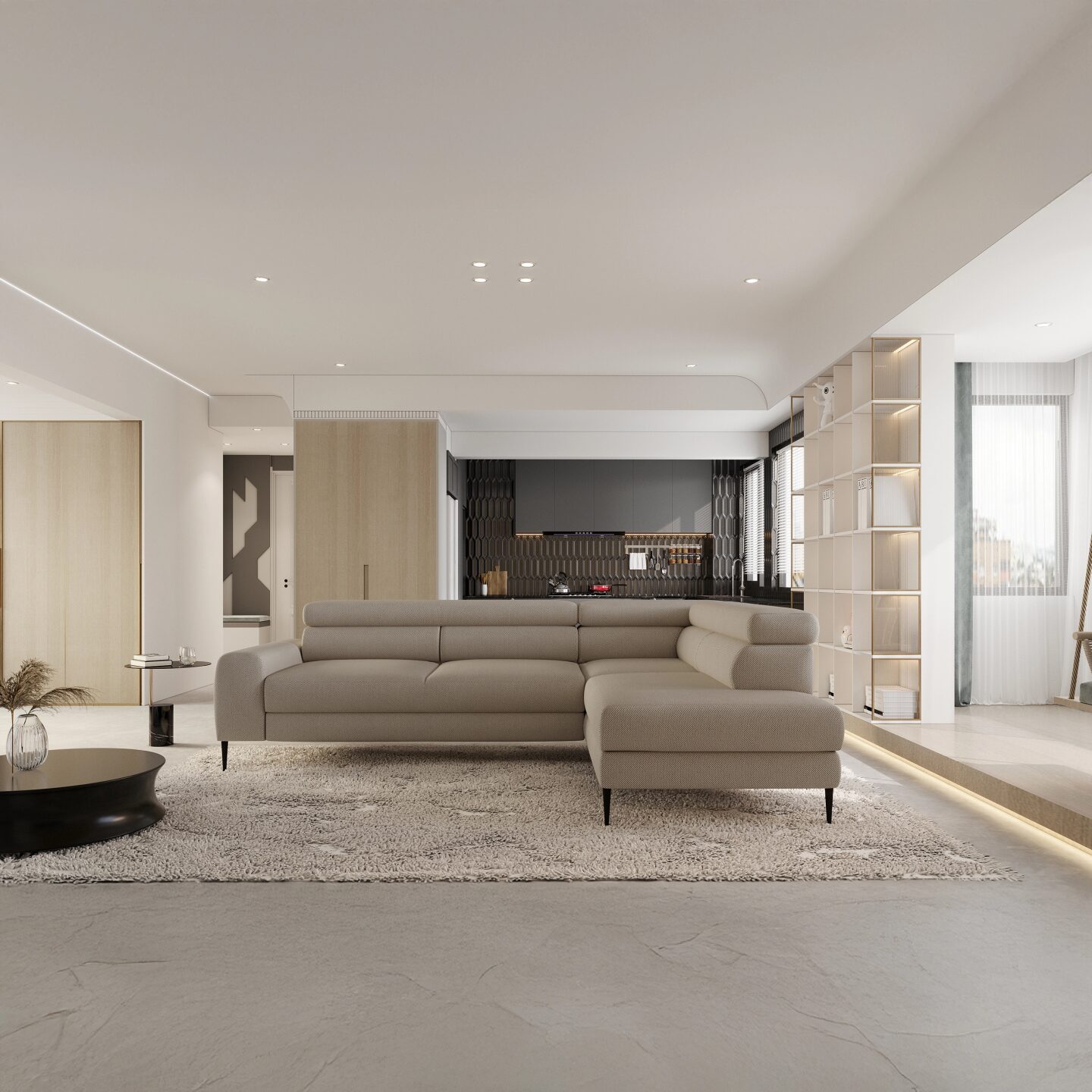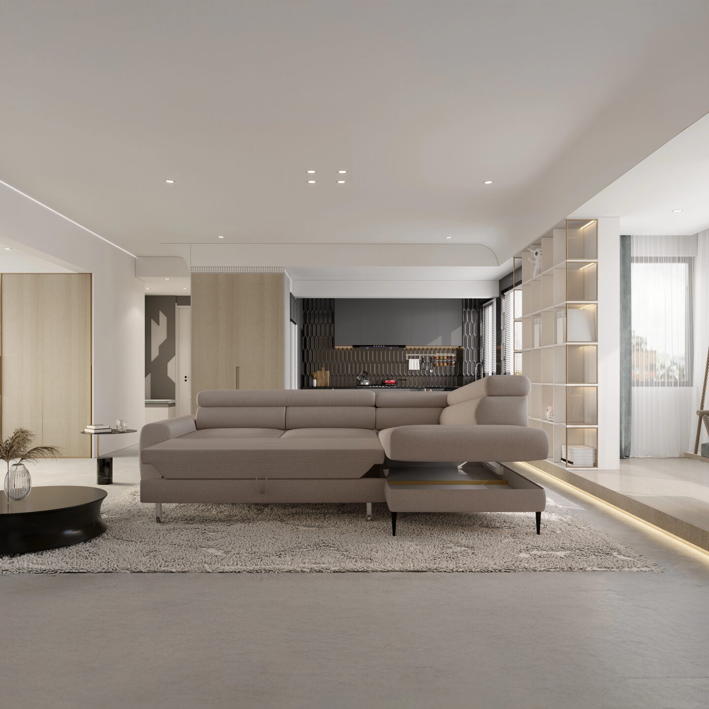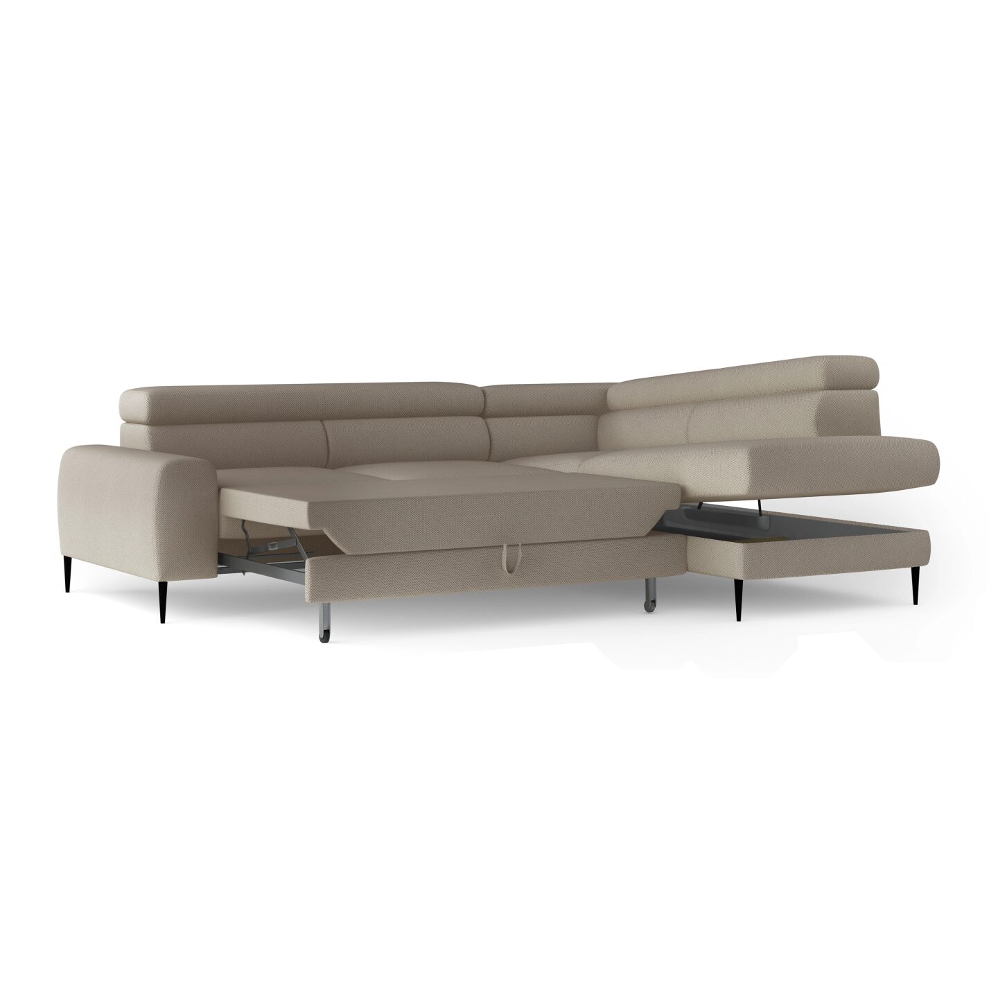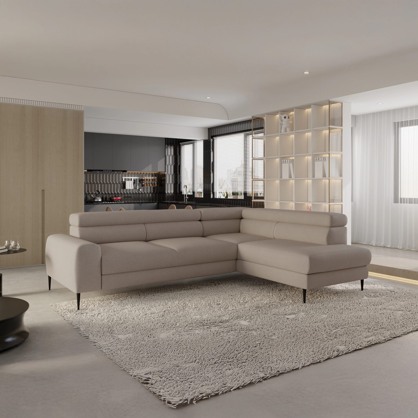„Calcio L“ kampinė sofa – stilingas ir funkcionalus baldas, kuriame dera modernus dizainas ir maksimalus komfortas. Su miegojimo funkcija („Delfin“ sistema), reguliuojamomis galvos atramomis ir daiktadėže, ji puikiai tinka tiek dienos, tiek nakties poilsiui. Aukštos kojelės suteikia lengvumo ir elegancijos, o apmuštas atlošas leidžia sofą pastatyti bet kurioje svetainės vietoje. Dėl madingų audinių ir aukštų kojelių ji atrodo lengva ir elegantiška, puikiai atitinkanti dabartines interjero dizaino tendencijas.