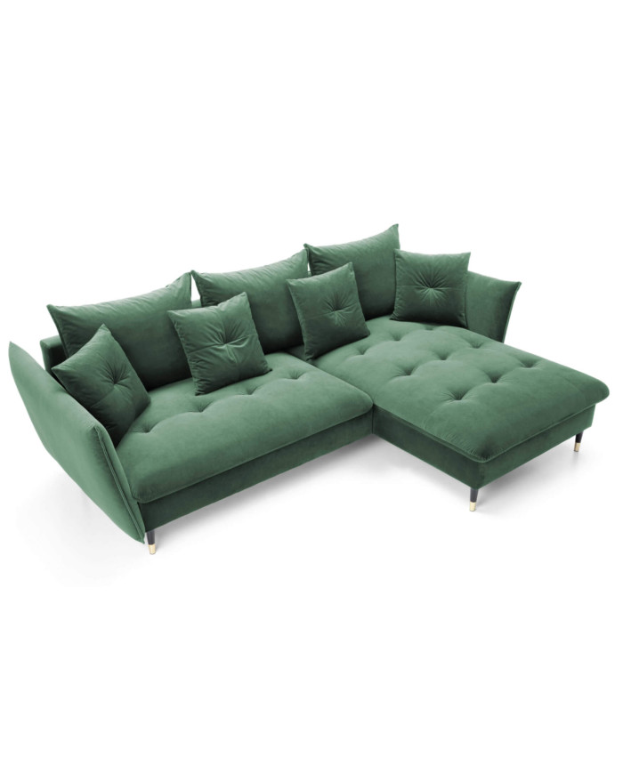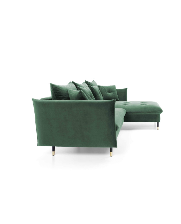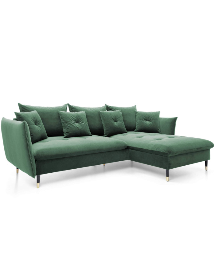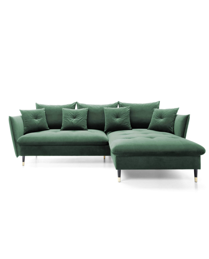 „Glam“ kampinė sofa-lova pasižymi dideliu dekoratyvinių pagalvėlių ir nuimamų nugaros pagalvėlių pasirinkimu. Nepaisant modernaus charakterio, ši sofa pasižymi ryškiomis klasikinėmis savybėmis, kurias dar labiau pabrėžia gilios sėdynės pagalvėlės. Ji puikiai papildys glamūriško stiliaus interjerus. Dekoratyviniu audiniu aptrauktas atlošas leidžia sofą pastatyti bet kokiu atstumu nuo sienos, atverdamas papildomas dizaino galimybes tiek interjerui, tiek patiems baldams. Kampinė sofa turi „DL“ dienos miegojimo funkciją, kuri greitai ir lengvai paverčia patogią sofą erdvia vieta poilsiui naktį ir dieną. Erdvioje ir labai praktiškoje patalynės dėžėje taip pat tilps papildomos antklodės, pagalvės ir lovatiesės. Komplektas stovi ant tvirtų juodų kojelių su dekoratyviniu elementu ir pristatomas su minimaliu surinkimu. Jis tiekiamas dešininės ir kairės pusės versijomis ir yra pagamintas iš plataus audinių asortimento. Apmušalų audinių pavyzdžius galite rasti „Product Creator“ svetainėje.