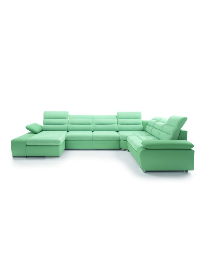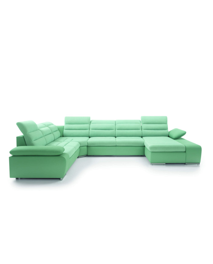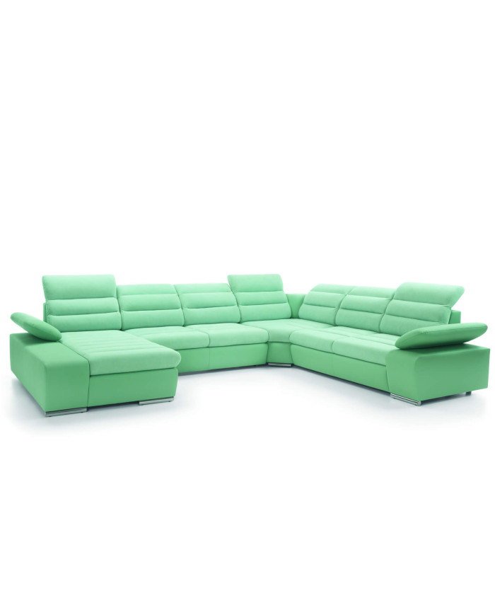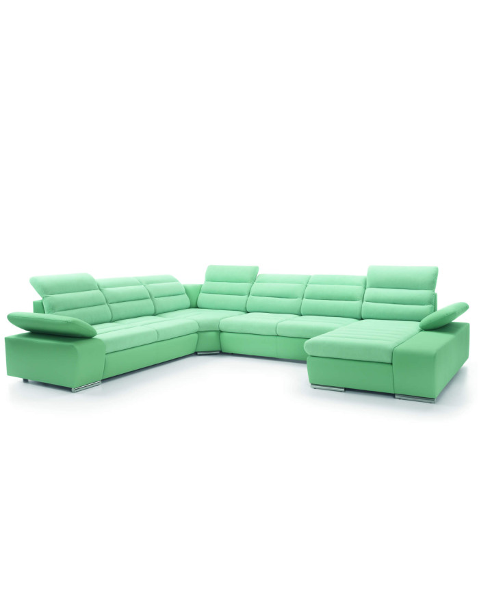 Elegantiška ir erdvi kampinė sofa „Korfu 3“ traukia dėmesį patraukliu dizainu, kurį pabrėžia horizontaliai dygsniuotos atlošo pagalvėlės. Ši U formos kampinė sofa su miegojimo funkcija ne tik talpina visą šeimą, bet ir siūlo patogią vietą poilsiui dieną ir naktį, filmų žiūrėjimui, popietės miegui ar svečių priėmimui. „Meble Piaski“ kampinė sofa „Korfu 3“ – puikus pasirinkimas tiems, kurie tikisi komforto, funkcionalumo ir stilingo dizaino viename. Aukšti atlošai su reguliuojamomis, integruotomis galvos atramomis ir reguliuojamais porankiais suteikia aukščiausią atsipalaidavimo lygį.