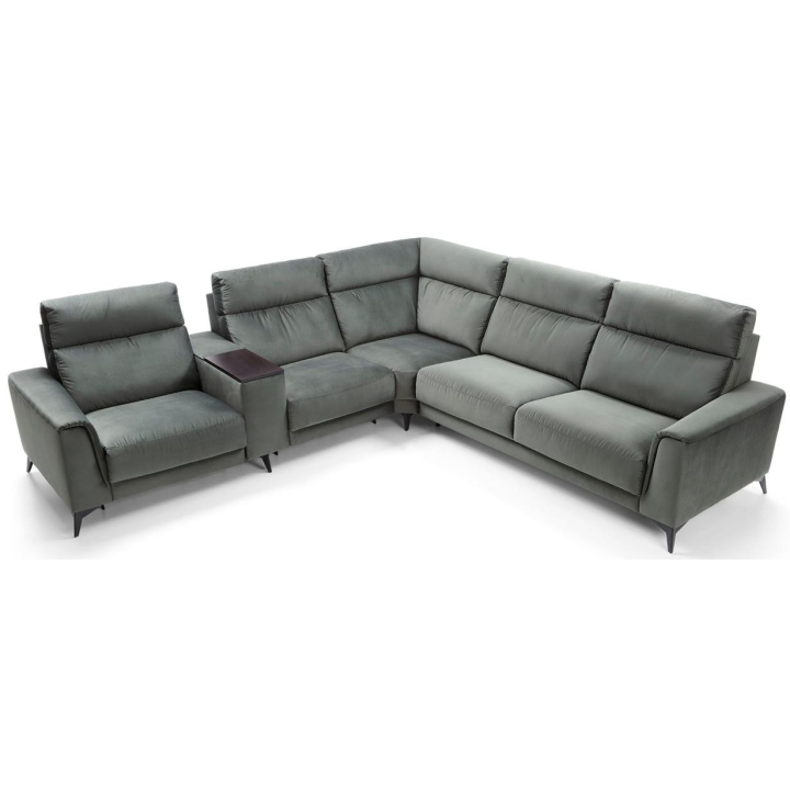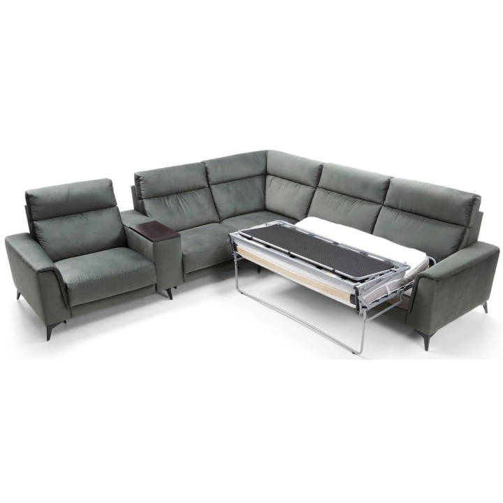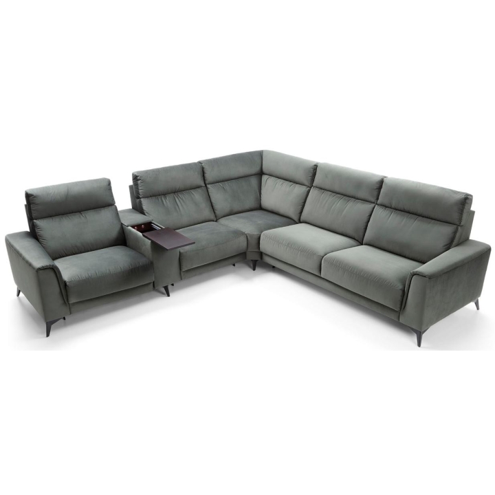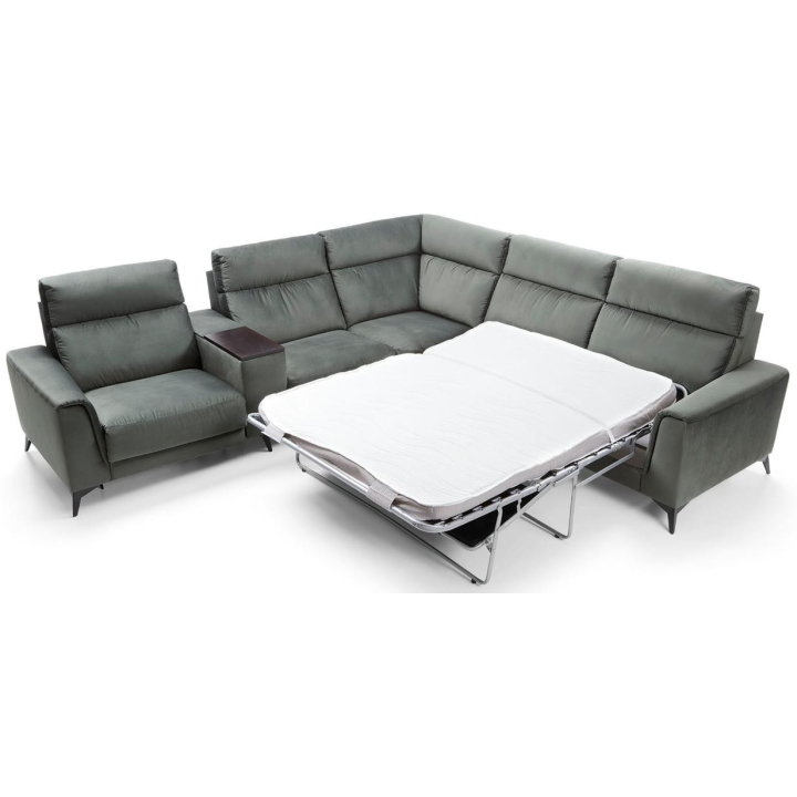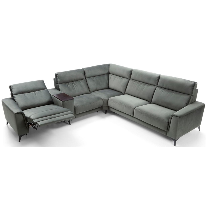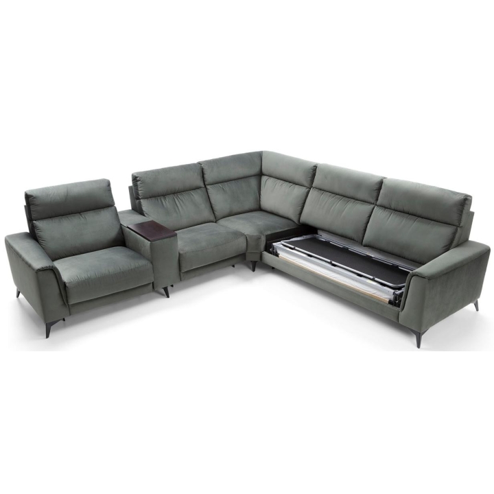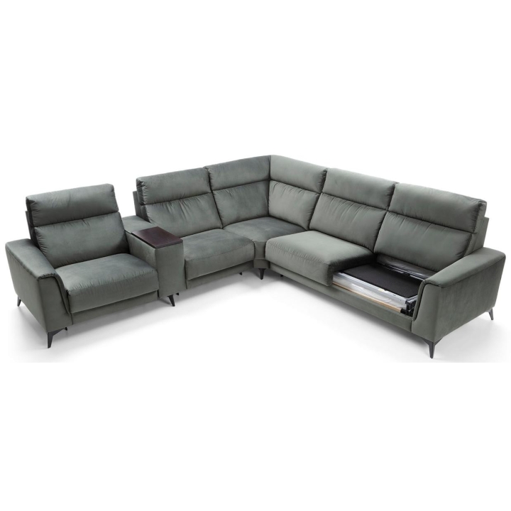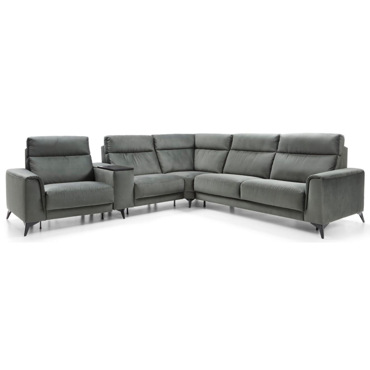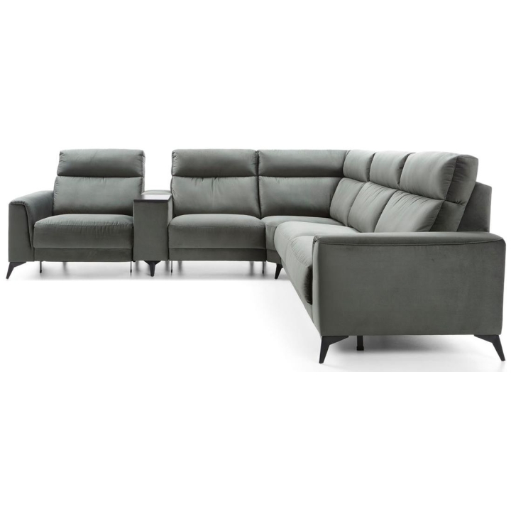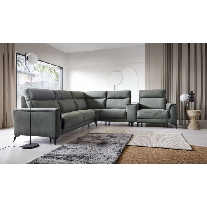 Kampinės sofos sėdynė pagaminta iš vingiuotų spyruoklių, derinamų su didelio elastingumo putomis ir poliuretano putomis, kurios užtikrina tvirtą ir patvarią atramą. Atlošas sukonstruotas su elastiniais dirželiais ir „Fiocco“ silikoniniu užpildu, todėl išlieka minkštas net ir po ilgo naudojimo. Dizainą papildo tvirti porankiai, suteikiantys papildomo komforto. „Legato“ modelis turi elektrinę atsipalaidavimo funkciją, leidžiančią sklandžiai reguliuoti sėdynės ir atlošo padėtį pagal individualius poreikius. Papildomas patogumas – baras su ištraukiama viršutine lentyna ir USB prievadu, puikiai tinkančiu atsipalaiduoti vakare su knyga, gėrimu ar mobiliaisiais įrenginiais. Prireikus kampinė sofa taip pat gali būti naudojama kaip lova – miegojimo plotas yra 143 x 185 cm, todėl galima patogiai pernakvoti.