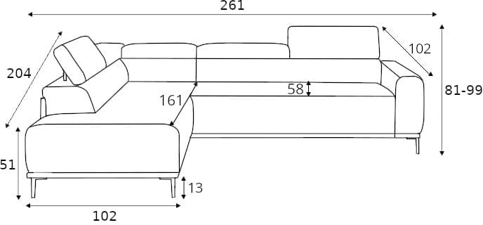 „Gandi L Corner“ kampinė sofa su gražiomis vertikaliomis siūlėmis siūloma trijų versijų: 120, 140 ir 160. 120 modelio matmenys – 261x99x204 cm, 140 modelio – 281x99x204 cm, o 180 modelio – 301x99x204 cm. Sėdynės užpildas – A tipo banguotos spyruoklės, N30 poliuretano putos. Atlošo užpildas – N1818 poliuretano putos. Visi baldai turi miegojimo funkciją, itališką rėmą ir erdvų patalynės dėklą. Papildomi privalumai – reguliuojamos galvos atramos ir dekoratyvinės siūlės ant sėdynės ir atlošo. Metalinės kojelės yra 13 cm aukščio. Galima rinktis kairinės ir dešininės puses. Čiužinys yra 14 cm aukščio ir pagamintas iš putplasčio.