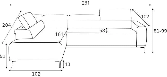 „Gandi L Corner“ kampinė sofa su gražiomis vertikaliomis siūlėmis siūloma trijų versijų: 120, 140 ir 160. 120 modelio matmenys – 261x99x204 cm, 140 modelio – 281x99x204 cm, o 180 modelio – 301x99x204 cm. Sėdynės užpildas – A tipo banguotos spyruoklės, N30 poliuretano putos. Atlošo užpildas – N1818 poliuretano putos. Visi baldai turi miegojimo funkciją, itališką rėmą ir erdvų patalynės dėklą. Papildomi privalumai – reguliuojamos galvos atramos ir dekoratyvinės siūlės ant sėdynės ir atlošo. Metalinės kojelės yra 13 cm aukščio. Galima rinktis kairinės ir dešininės puses. Čiužinys yra 14 cm aukščio ir pagamintas iš putplasčio.