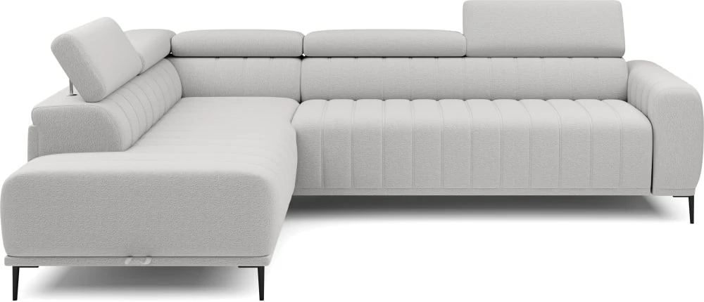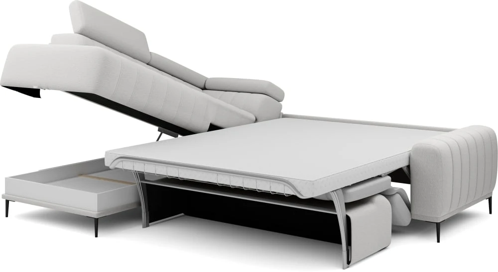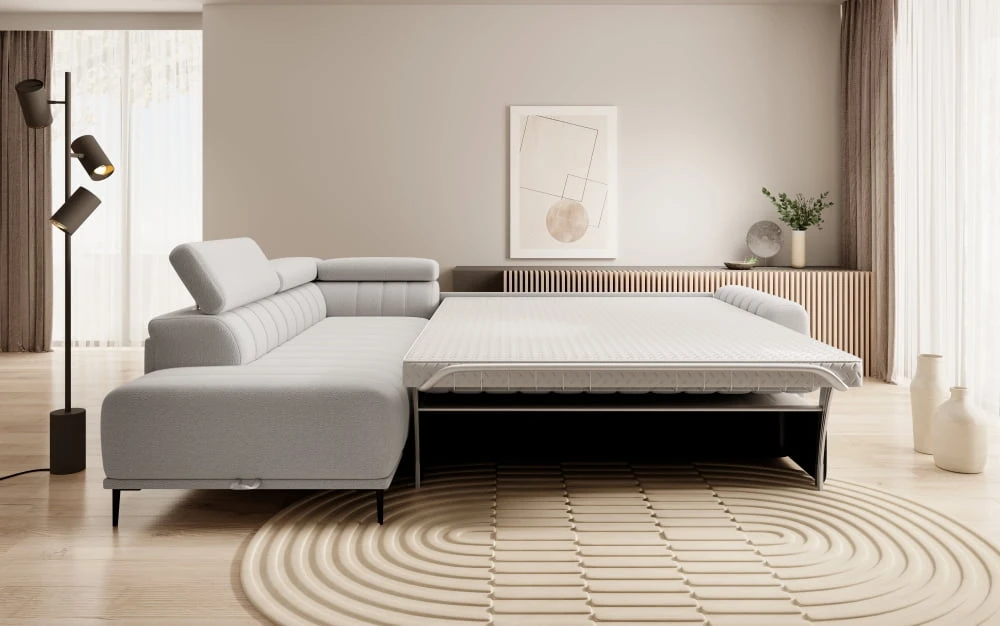Kairysis kampinis sofa Gandi L Corner 140 su miegamąja funkcija, itališko tipo rėmu ir Gr1 konteineriu