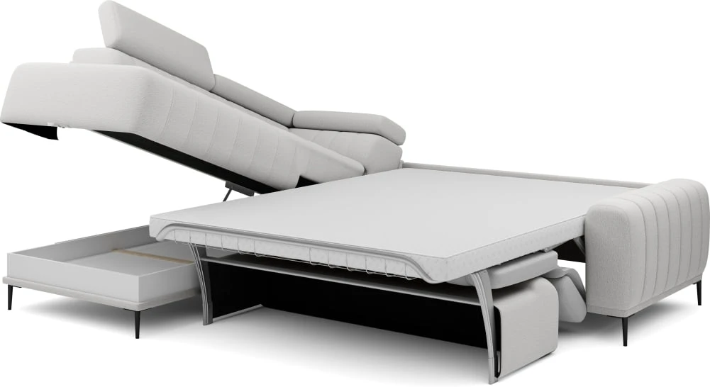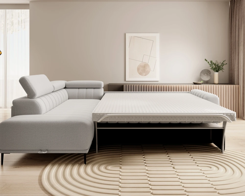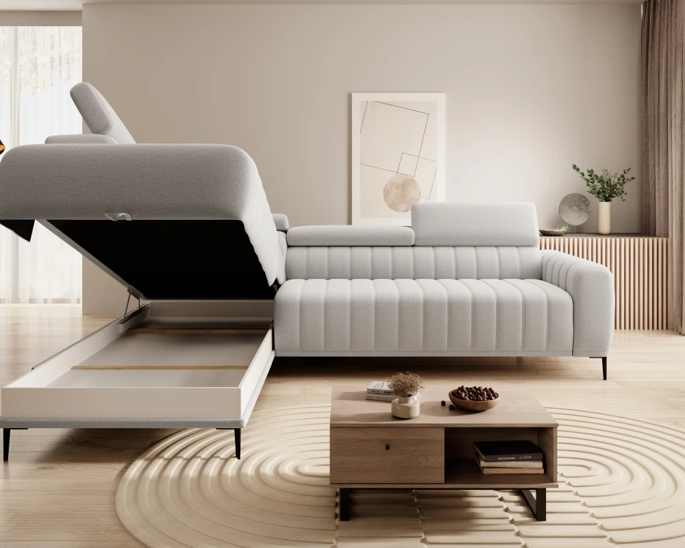 Kairysis kampinis sofa Gandi L Corner 160 su miegamąja funkcija, itališko tipo rėmu ir Gr1 konteineriu