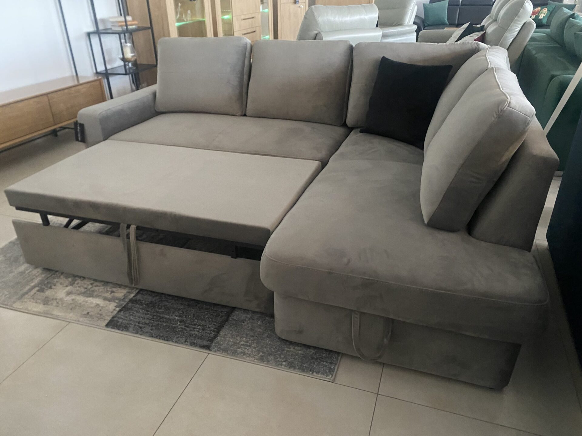 Moderni kampinė sofa pasižymi moderniu, tačiau unikaliu dizainu. Dėl savo išvaizdos ji idealiai tinka paprastiems ir mažiems interjerams. Paprastumas ir subtilios pagalvėlių siūlės suteikia jai žavesio. Specifikacijos: - „Bonnell“ spyruoklės, - didelio elastingumo HR putos, - miegojimo funkcija, - patalynės laikymo vieta.