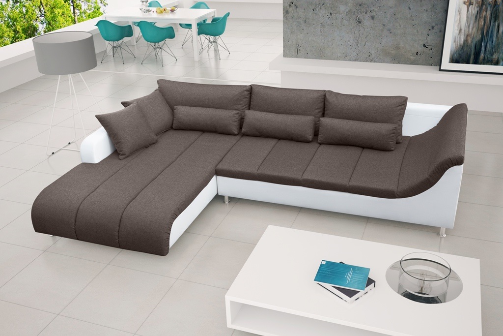 Jūsų pasirinktu audiniu aptrauktas atlošas, 8 patogios pagalvėlės ir patrauklūs porankiai.