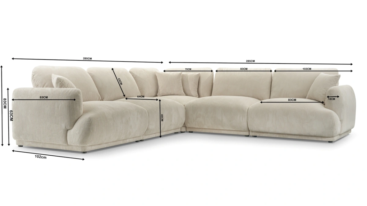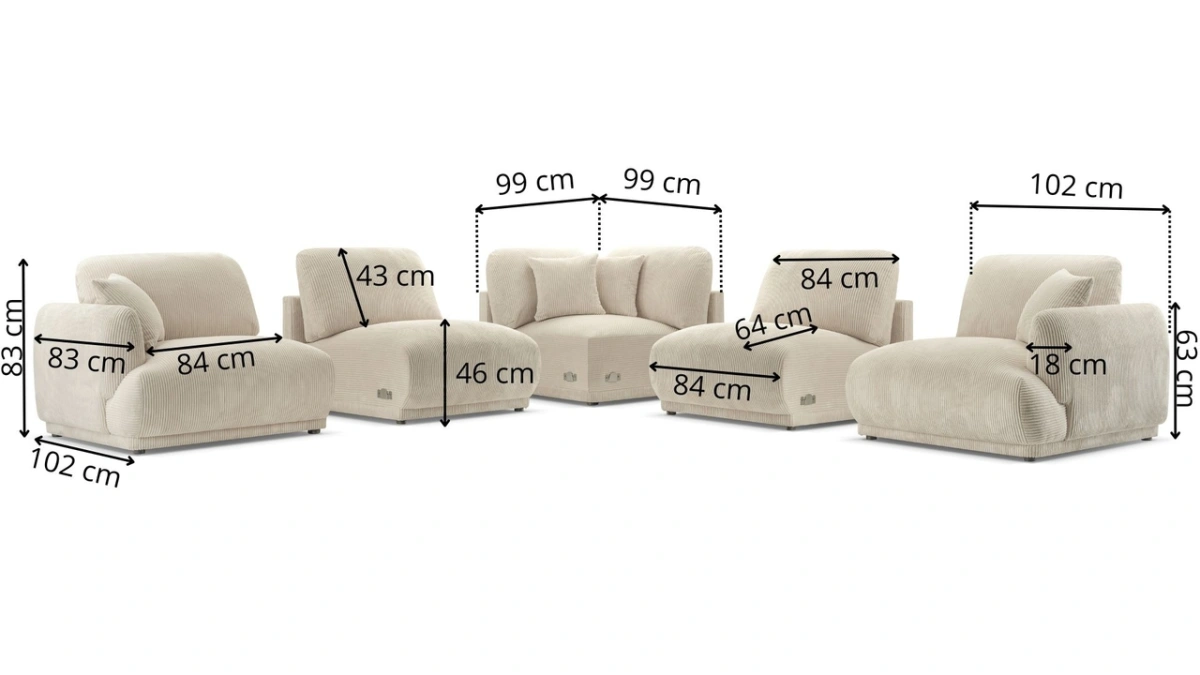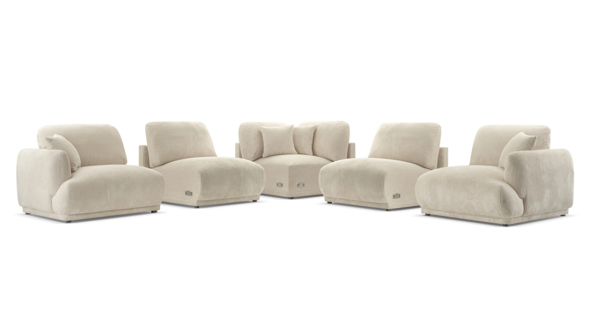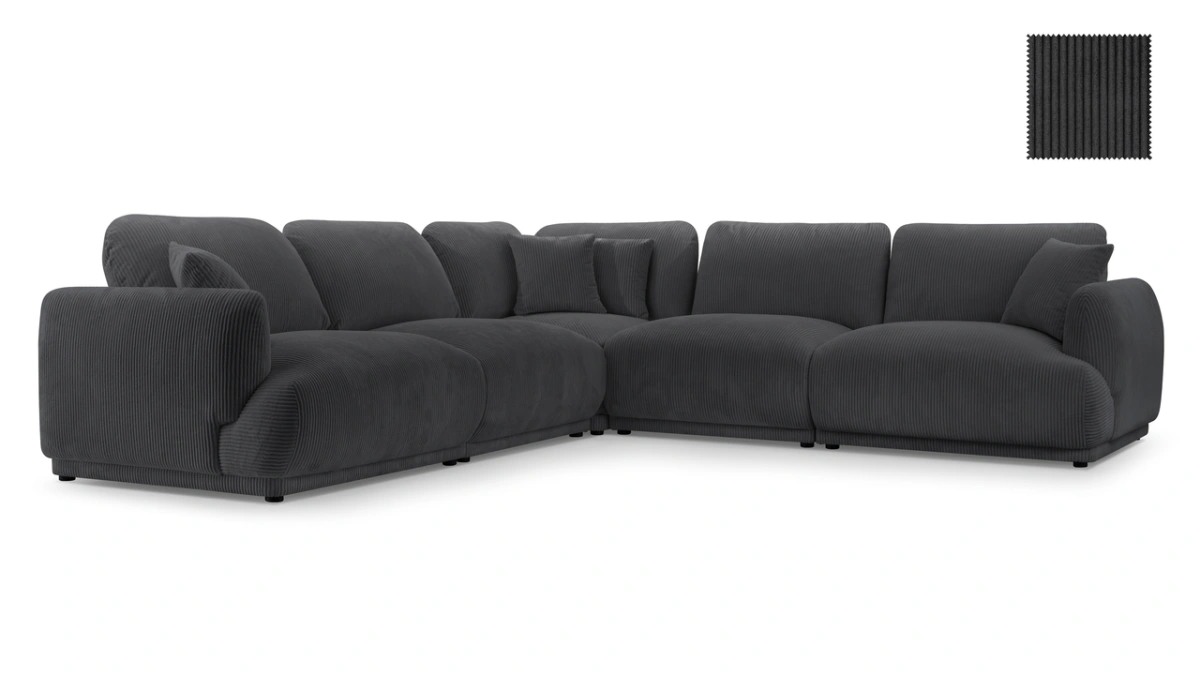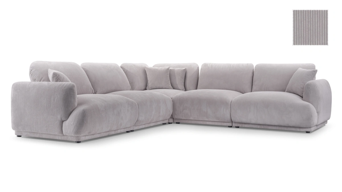 Kampinė sofa už nurodytą kainą susideda iš vienvietės šoninės dalies, vienvietės sėdimosios dalies, kampinės dalies, vienvietės sėdimosios dalies ir vienvietės šoninės dalies.