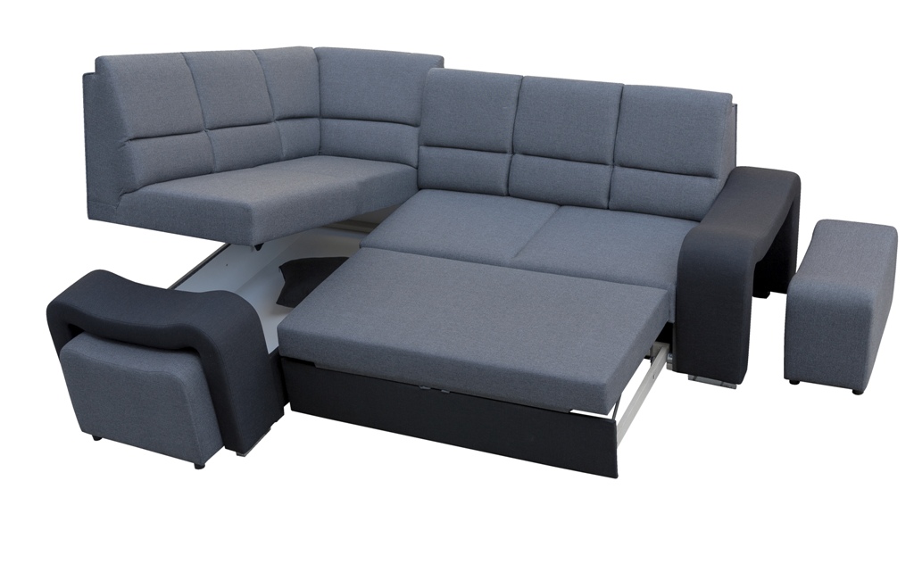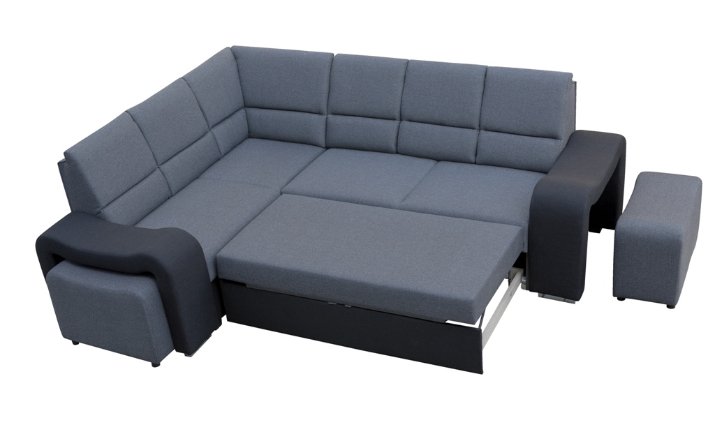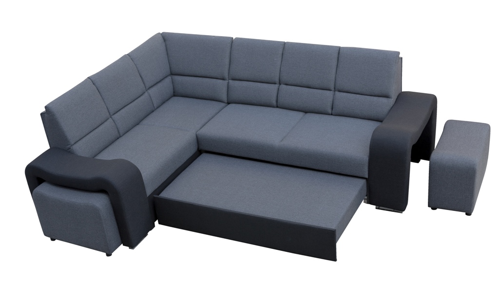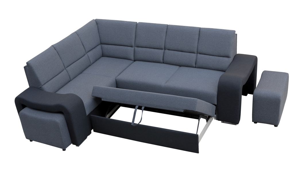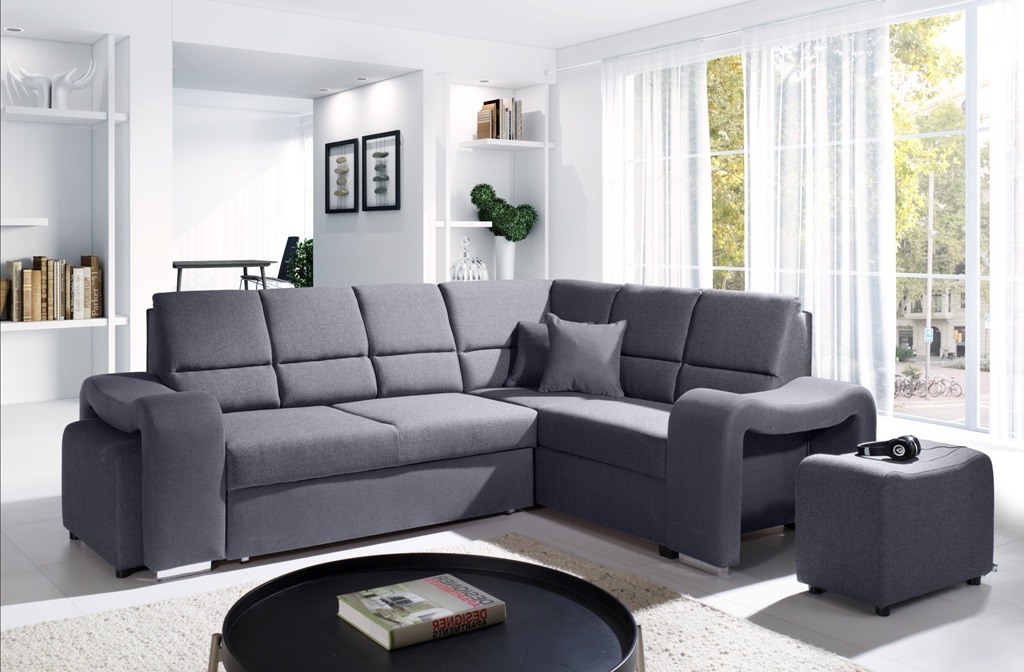 Išskleidžiama kampinė sofa turi daiktadėžę