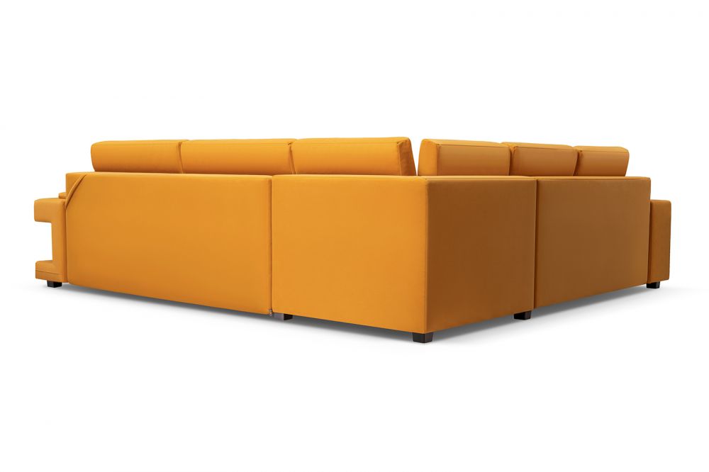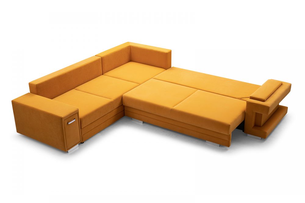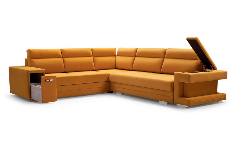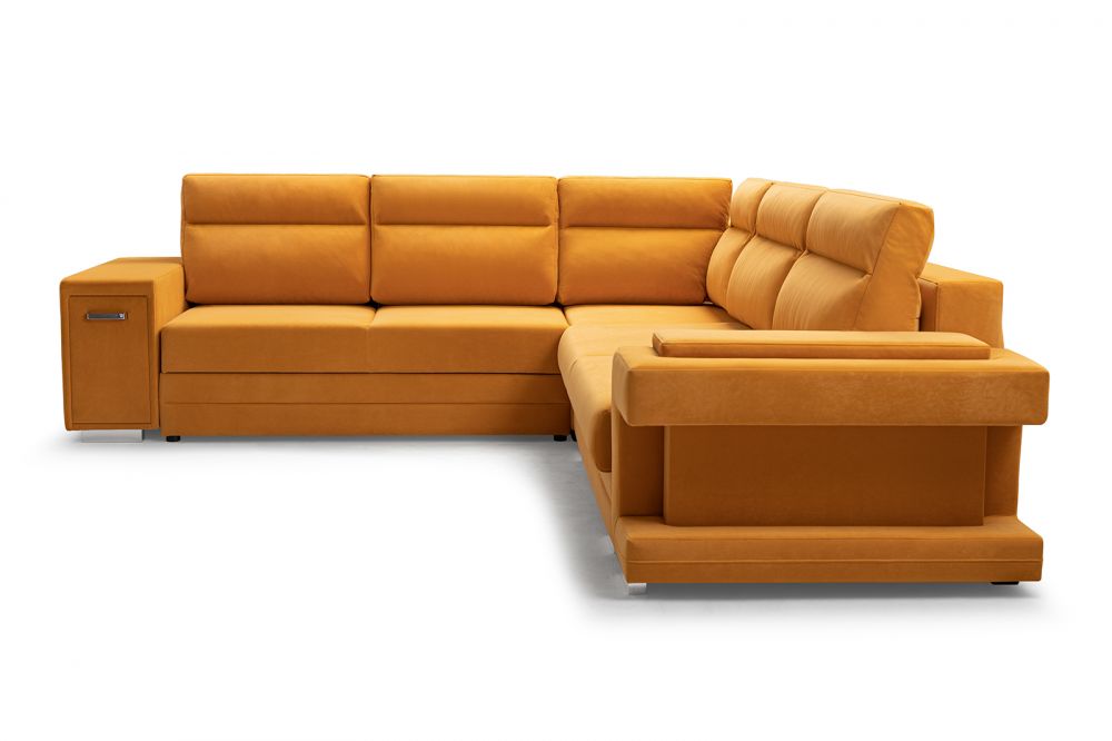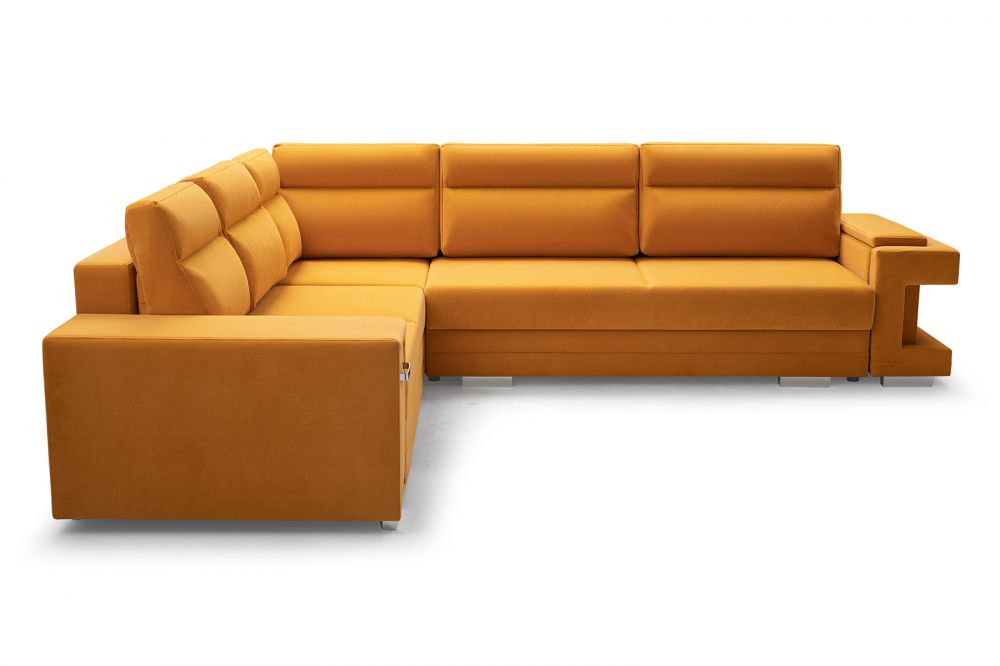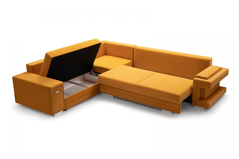 Atlošas aptrauktas pasirinktu audiniu, kampinė sofa turi barą ir daiktadėžę šone, o kojelės pagamintos iš chromuoto plastiko.