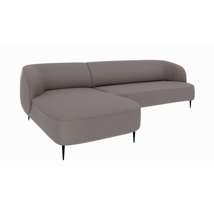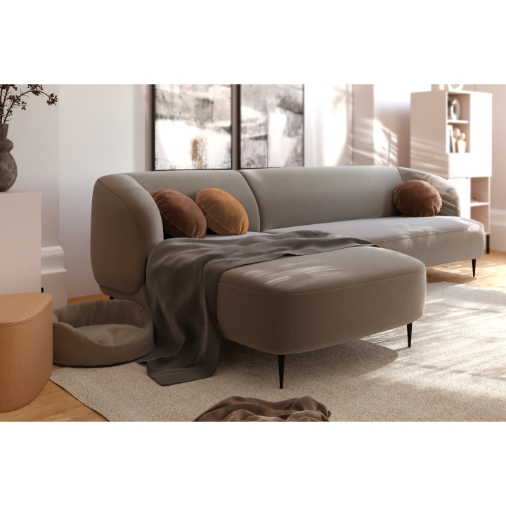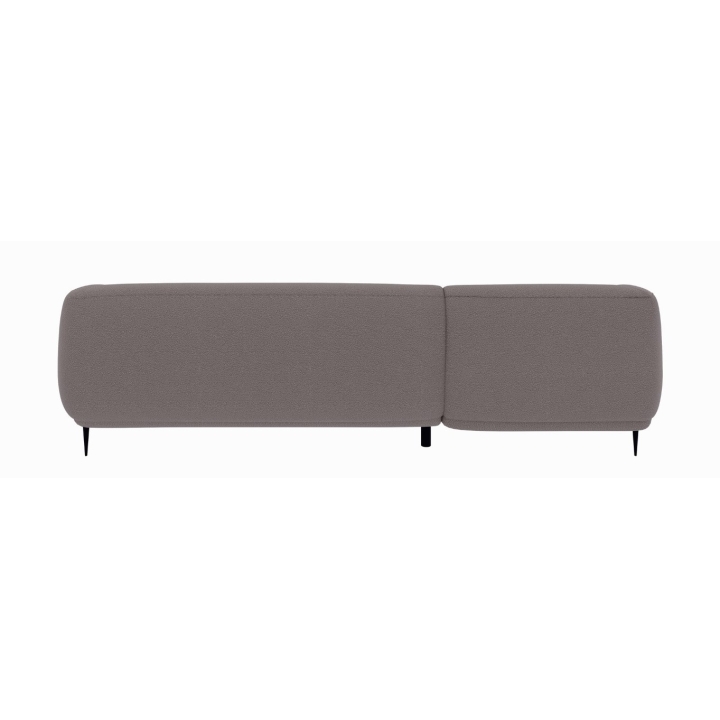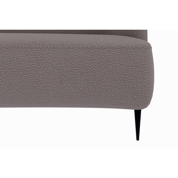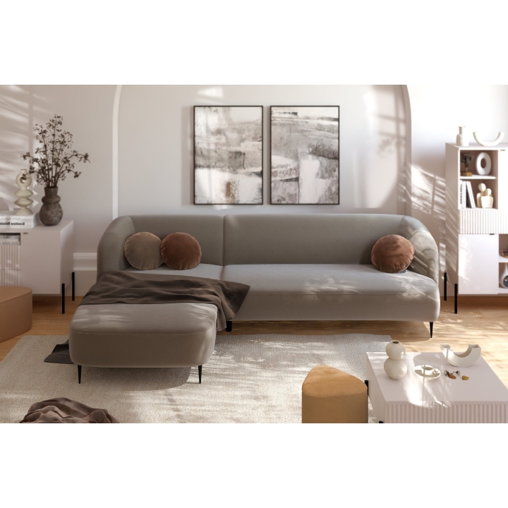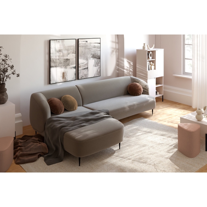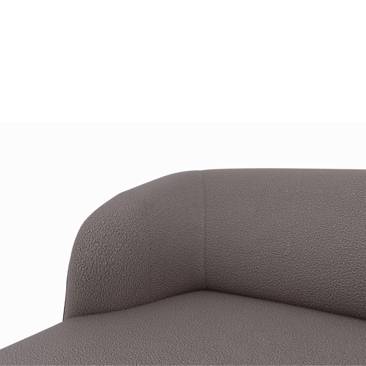 30/81/69 cm porankiai padidina sėdėjimo komfortą. 15,5 cm aukščio metalinės kojelės, padengtos matine juoda spalva, suteikia baldui vizualiai lengvumo ir leidžia lengvai išvalyti erdvę po kampine sofa. Konstrukcija išlieka stabili net ir intensyviai naudojant.