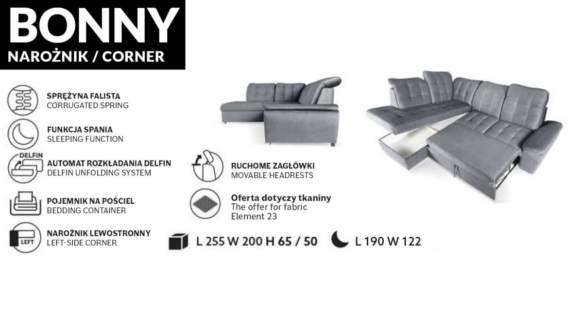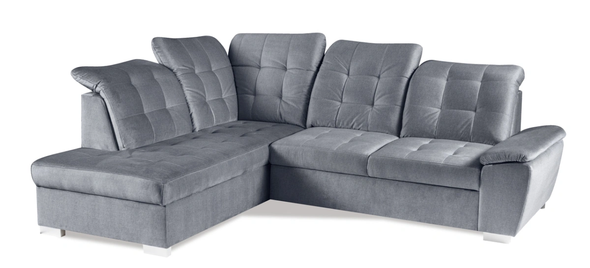 Kampinė sofa siūloma su 1, 6 ir 23 audinių pasirinkimais.