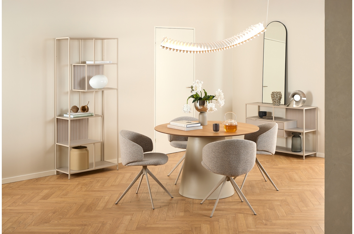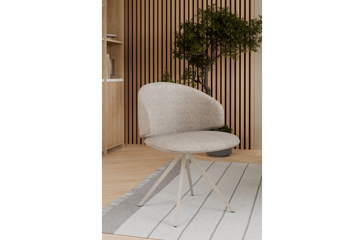 NELA Latte Beige (Monza 60 audinys) / smėlio spalvos kojelės – MODERNI SUKAMA KĖDĖ, APMUŠTA BUKLE APMUŠTU, BOHO VIRTUVEI / SVETAINEI