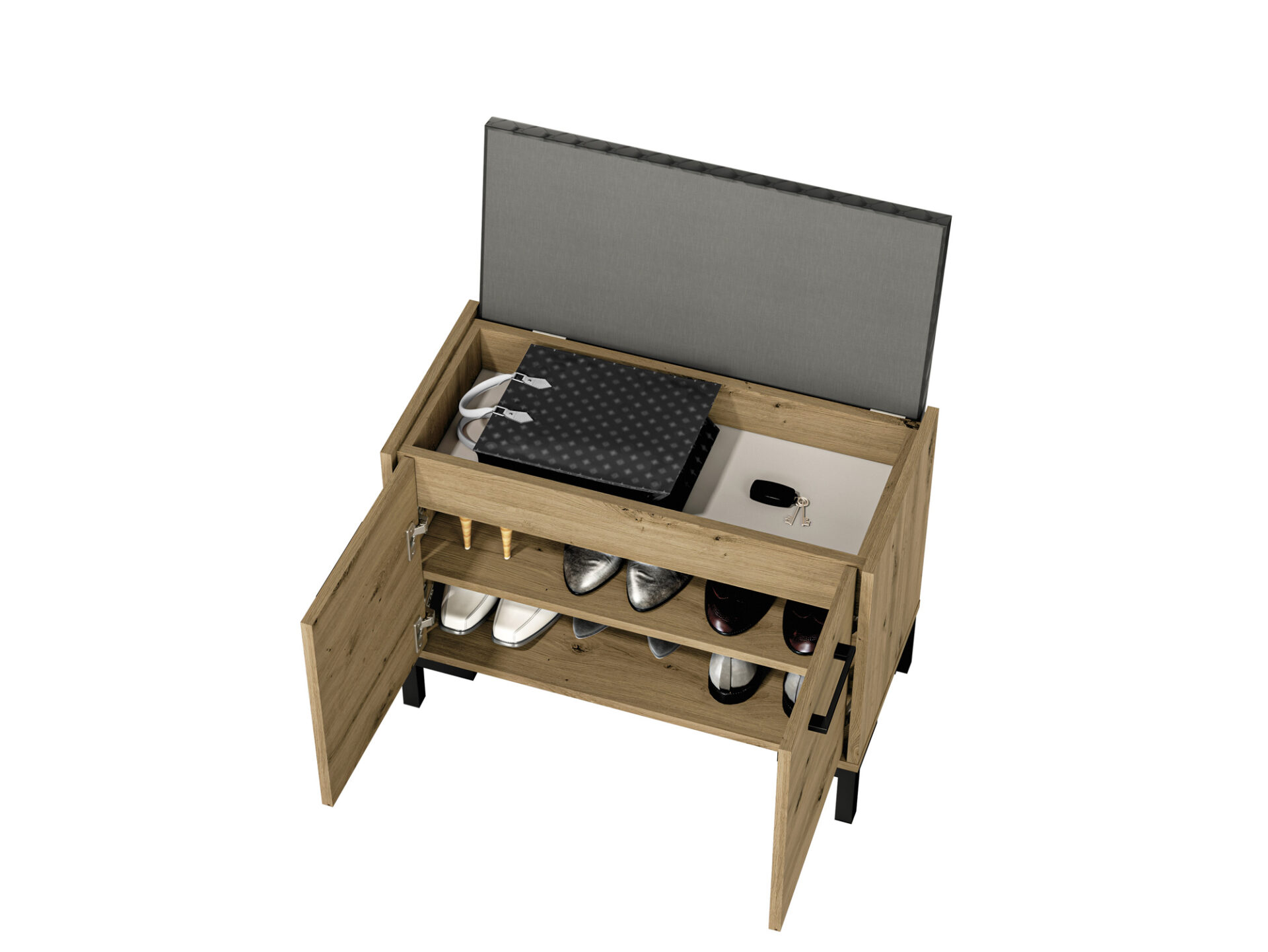 NEVIO 04 batų spintelė – tai apgalvotas sprendimas, kaip palaikyti tvarką prieškambaryje.