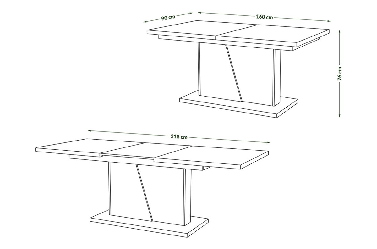 PLOTIS 160 cm / 218 cm, GYLIS 90 cm, AUKŠTIS 76 cm, ĮDĖKLŲ SKAIČIUS 1 vnt. x 58 cm (paslėpta po stalviršiu), FUNKCIJA Ištraukiamas stalviršis, PAVIRŠIUS Matinis, STILIUS Modernus, SVORIS SU PAKUOTE 71,5 kg