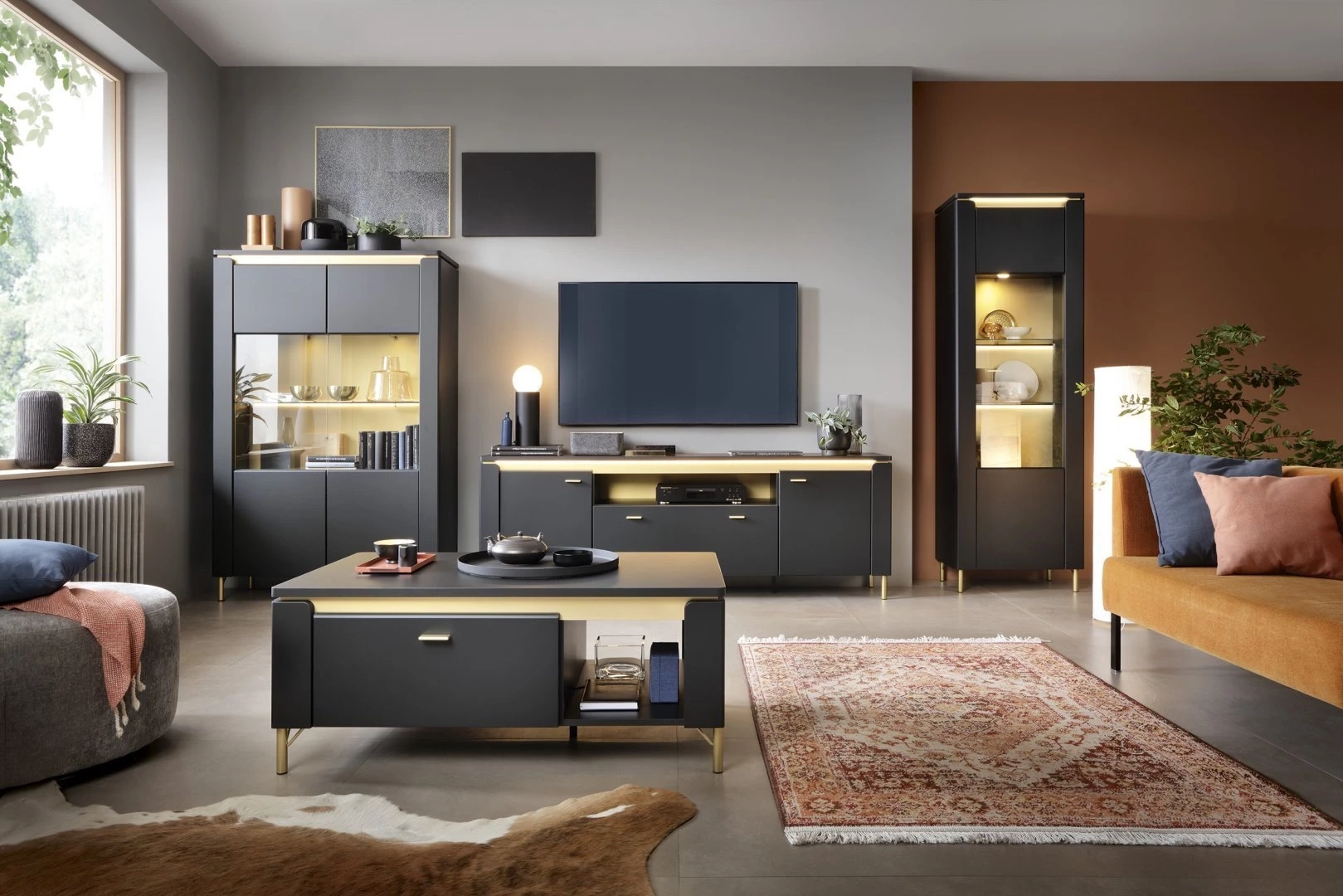Pagaminta iš aukštos kokybės laminuotos medžio drožlių plokštės ir MDF, vitrina yra išskirtinai patvari ir elegantiška. Matinė juoda spalva kartu su auksu sukuria nesenstantį dizainą, kuris lengvai papildys bet kokį interjero dizainą. Papildomas privalumas – TREND LED struktūrinis apšvietimas, suteikiantis spintelei prabangos. Vitrinos vidų galima dar labiau patobulinti pasirenkamu kvadratiniu arba prizminiu „Mini Trend“ vieno taško apšvietimu, sukuriančiu tobulą aplinką mėgstamiausiems daiktams eksponuoti.