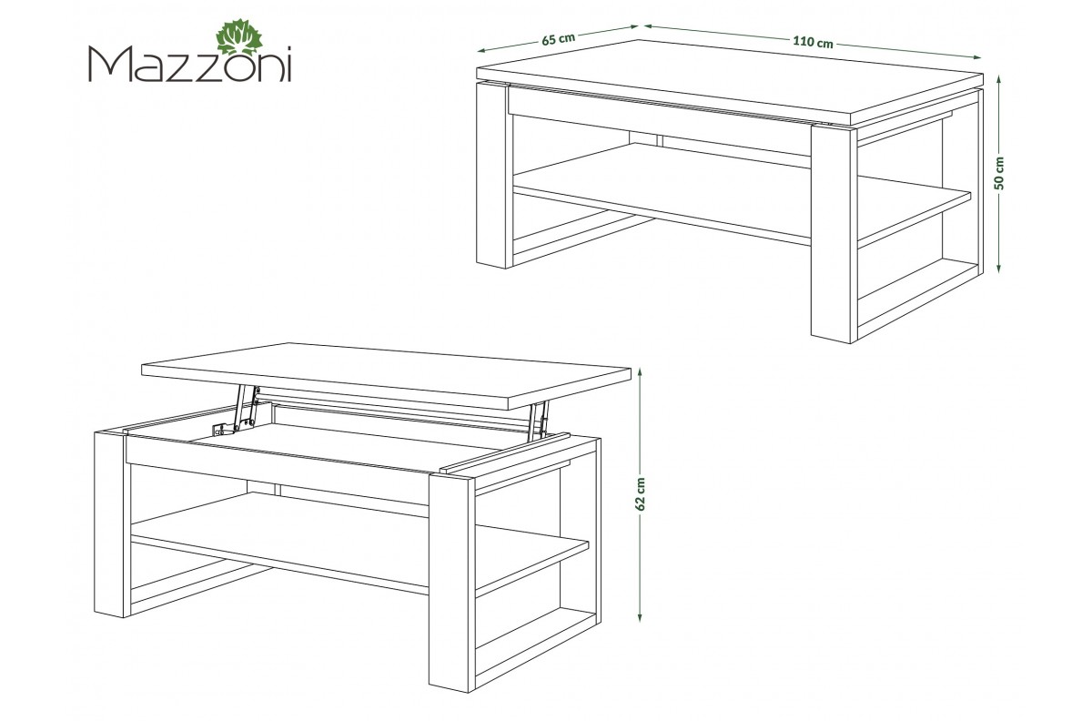 Kavos staliukas pagamintas iš aukštos kokybės, matinės medžio drožlių plokštės, laminuotos iš abiejų pusių, 28 ir 18 mm storio, apdailintos 1 mm ABS briaunomis.
