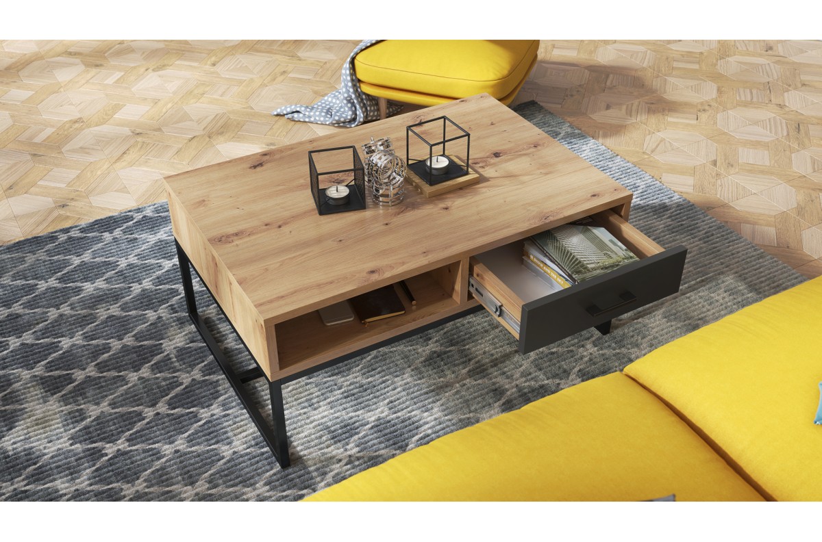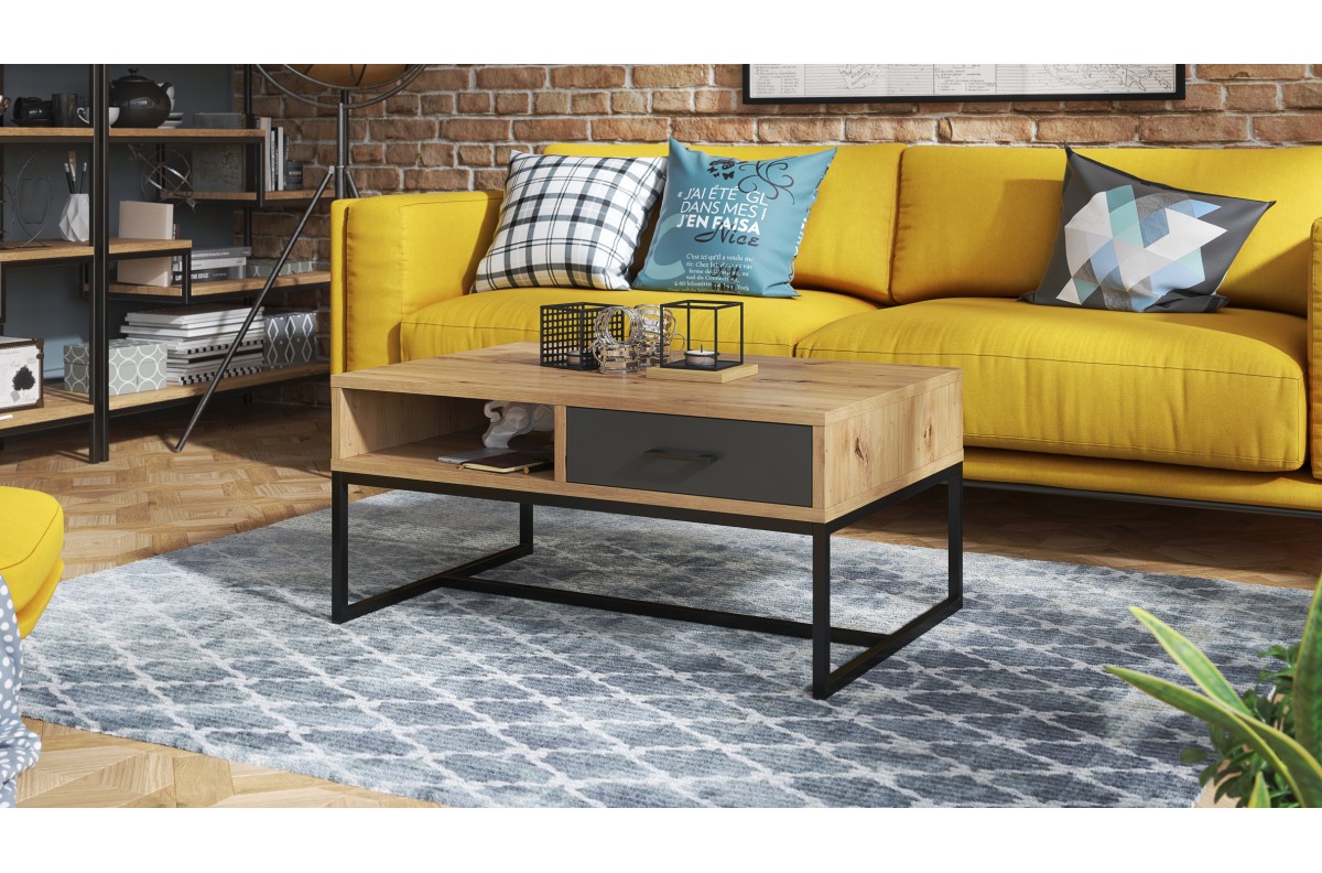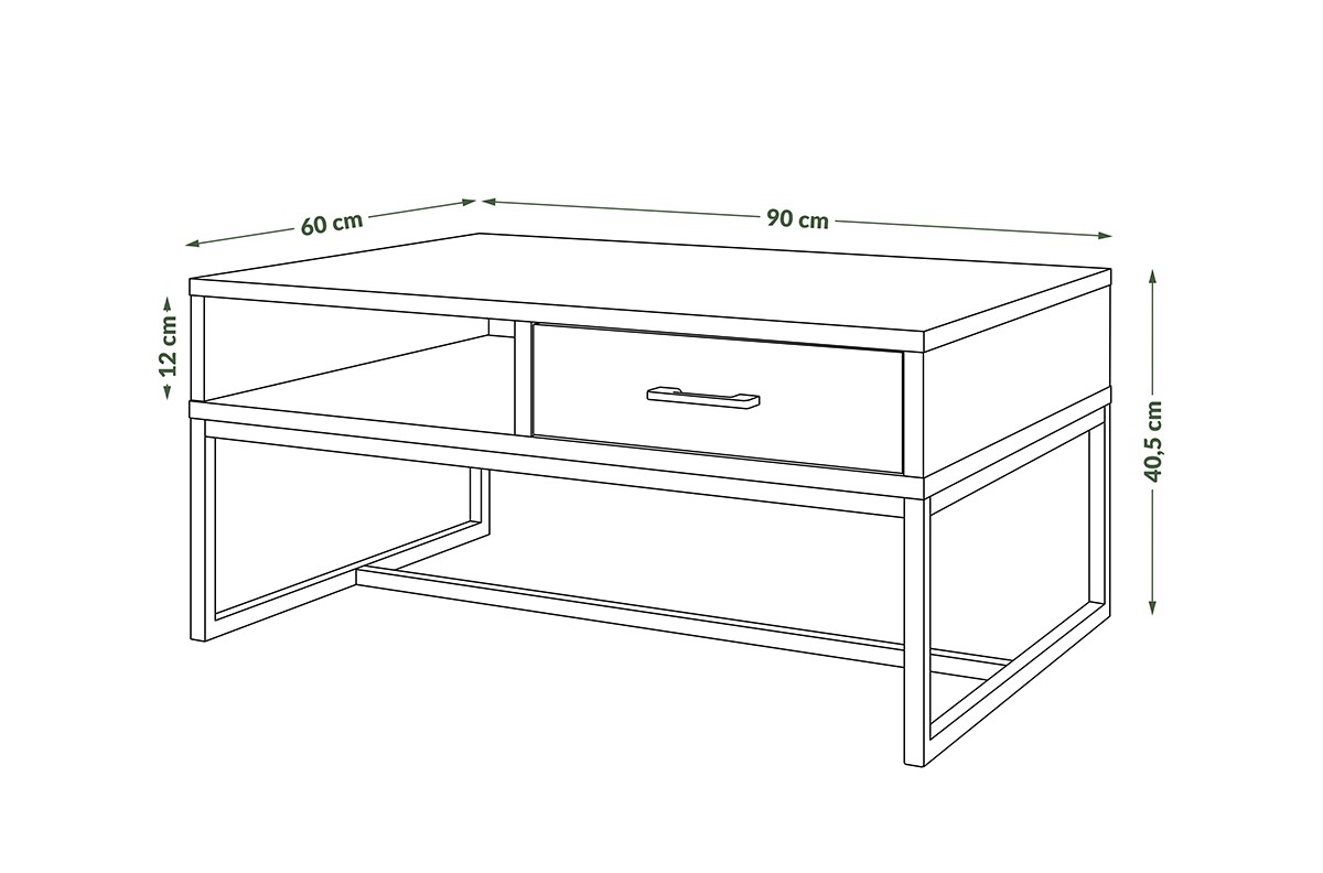 PLOTIS 90 cm, GYLIS 60 cm, AUKŠTIS 40,5 cm, MEDŽIAGOS: Medžio drožlių plokštė, PAVIRŠIUS: Matinis, STILIUS: Loft, SVORIS SU PAKUOTE 26 kg