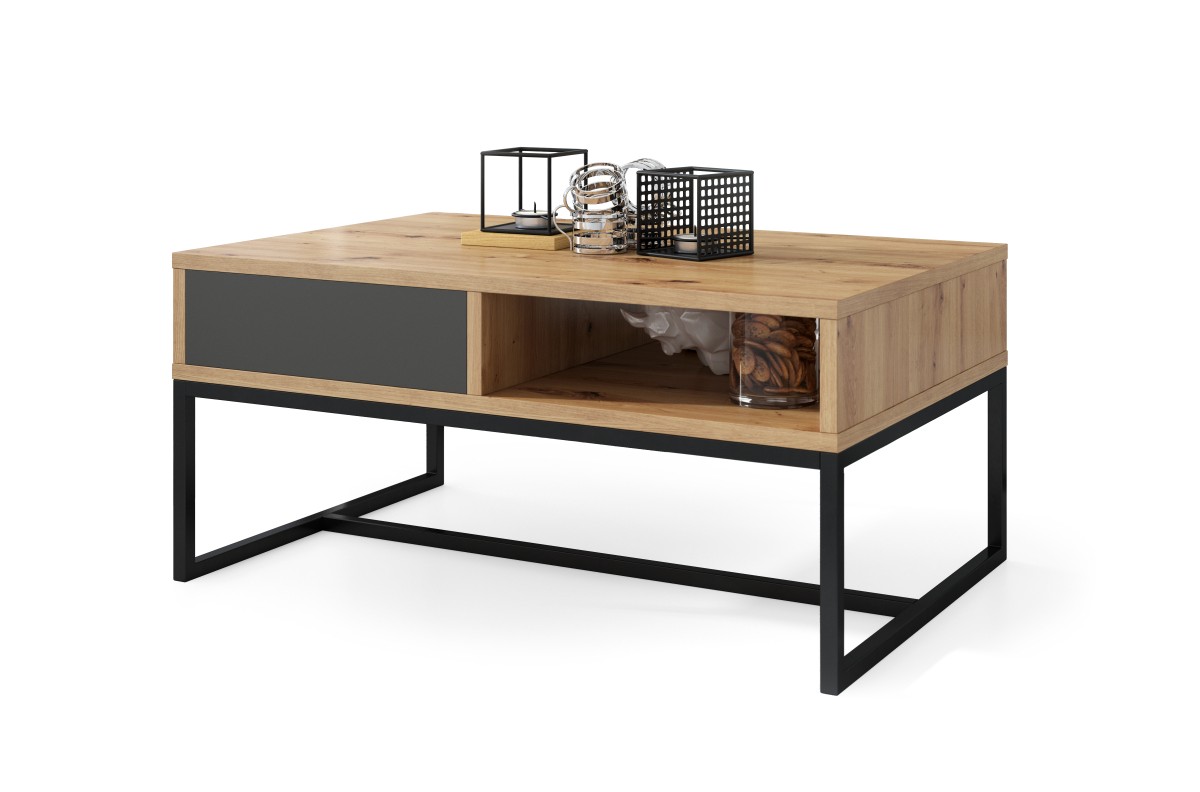 Kavos staliukas pagamintas iš 18 mm storio matinės medžio drožlių plokštės, laminuotos iš abiejų pusių. Visas gaminys apdailintas 1 mm ABS briauna. Papildomas elementas – juodai milteliniu būdu dažytas metalinis rėmas.