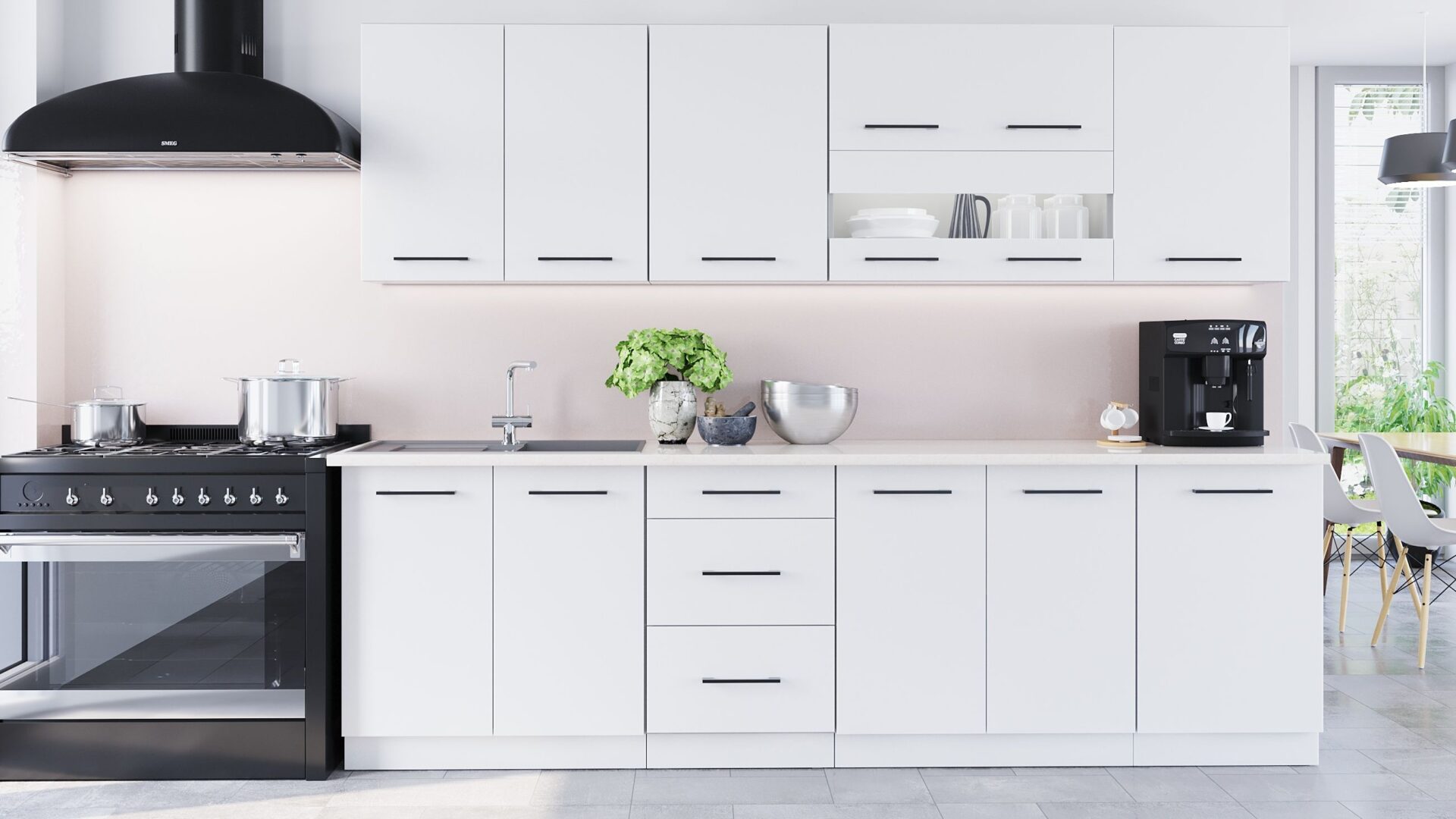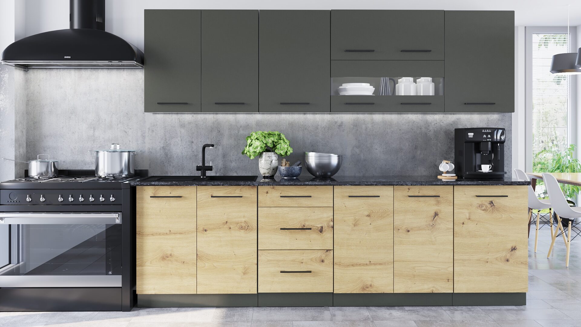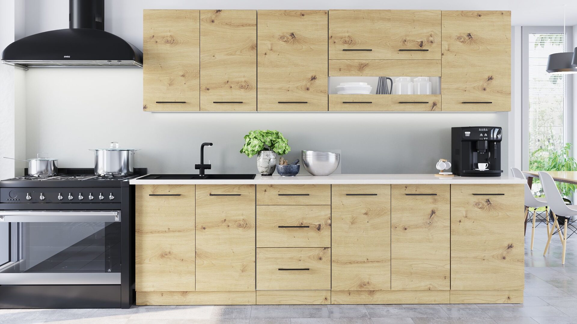 OLA virtuvė – tai paprastas, elegantiškas ir modernus virtuvės spintelių komplektas, pagamintas labai populiariu stiliumi. Šį komplektą sudaro 8 atskiros spintelės, kurias galima laisvai konfigūruoti, užtikrinant maksimalų naudojimo patogumą ir išdėstymo laisvę. Virtuvės komplekte yra stalviršis.