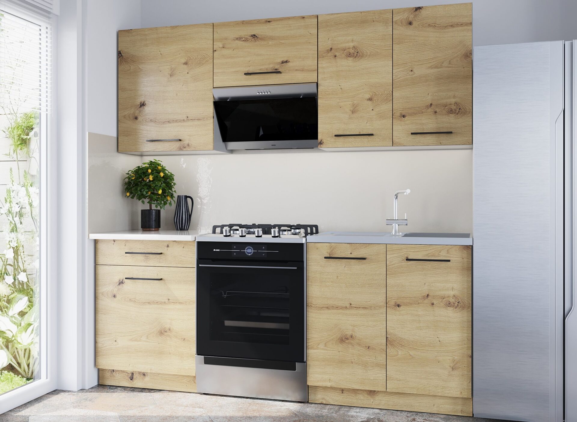 Visi nuotraukose parodyti priedai, tokie kaip buitinė technika, sieninė panelė, gartraukiai, ištraukimo gaubtai ir dekoratyviniai elementai, į komplektą neįeina.