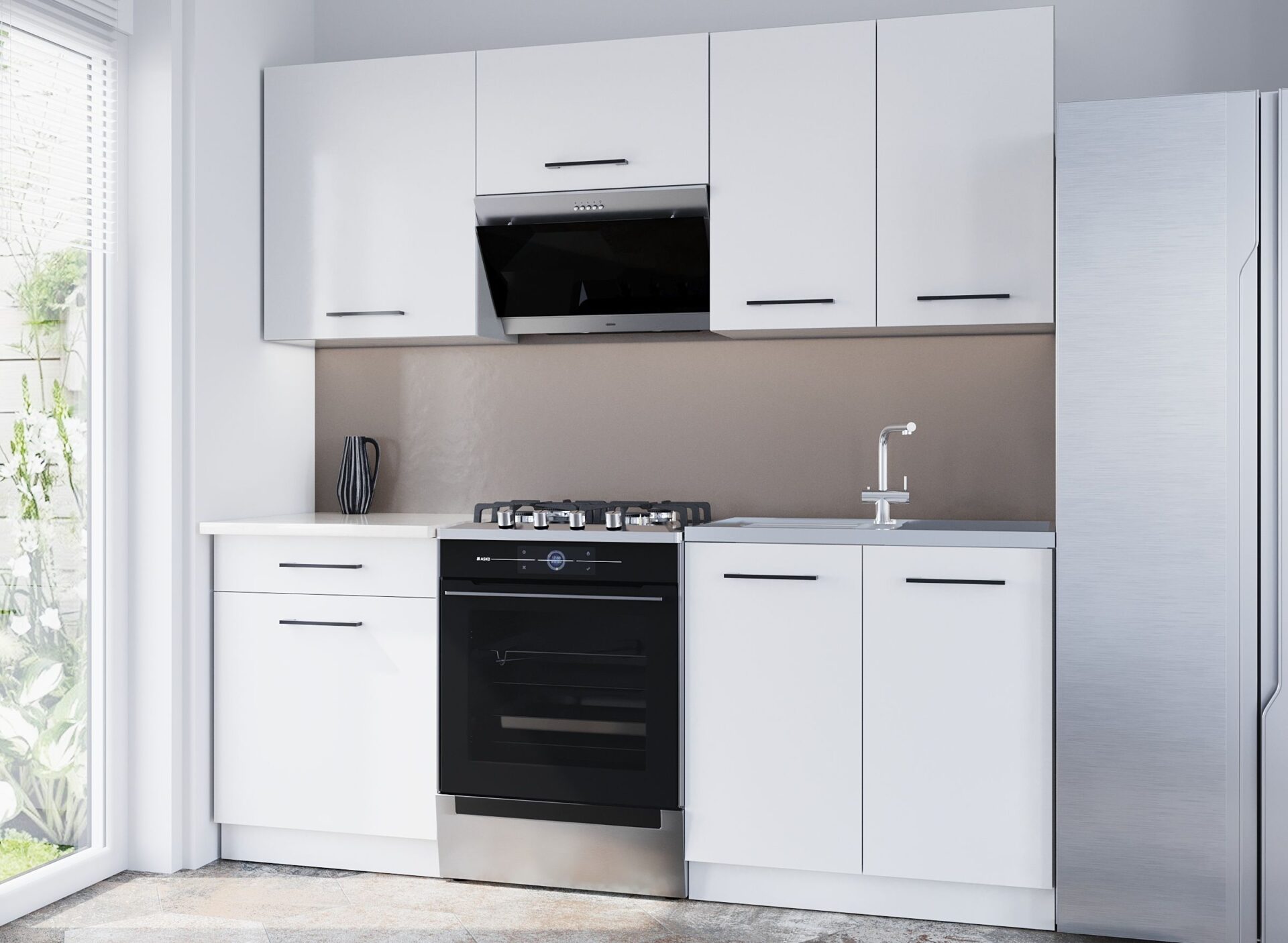 Vizualizacijoje pavaizduota virtuvė apdailinta šiomis spalvomis: baltas korpusas / „artisan“ fasadas.