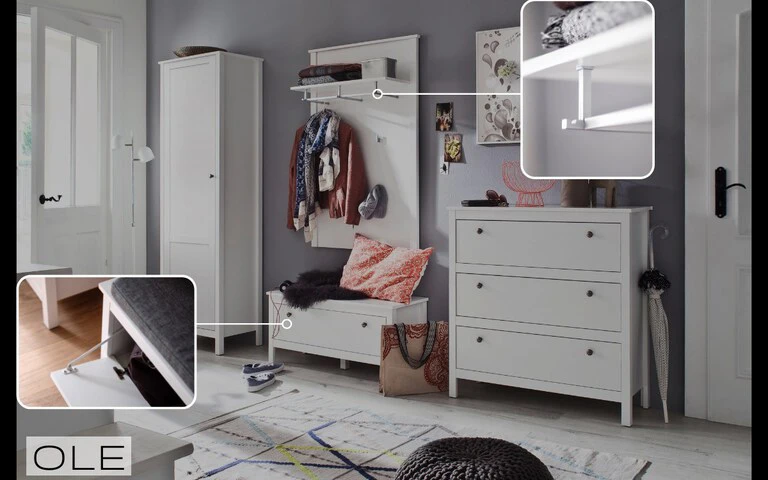 OLE matinės baltos spalvos lentyna su 1 durelėmis. Ole prieškambario lentyna siūlo daug vietos drabužiams ir aksesuarams. Ji pasižymi moderniu dizainu ir subtilia spalva. Lentyna pasižymi lengvai prižiūrimais paviršiais ir yra pagaminta iš FSC sertifikuotos medienos. Ole kolekcijos spinta yra vizualus ir praktiškas prieškambario ir įėjimo papildymas. Gaminio savybės: – subtilios kojelės – matinė balta folija – metalinė rankena – universalus stilius