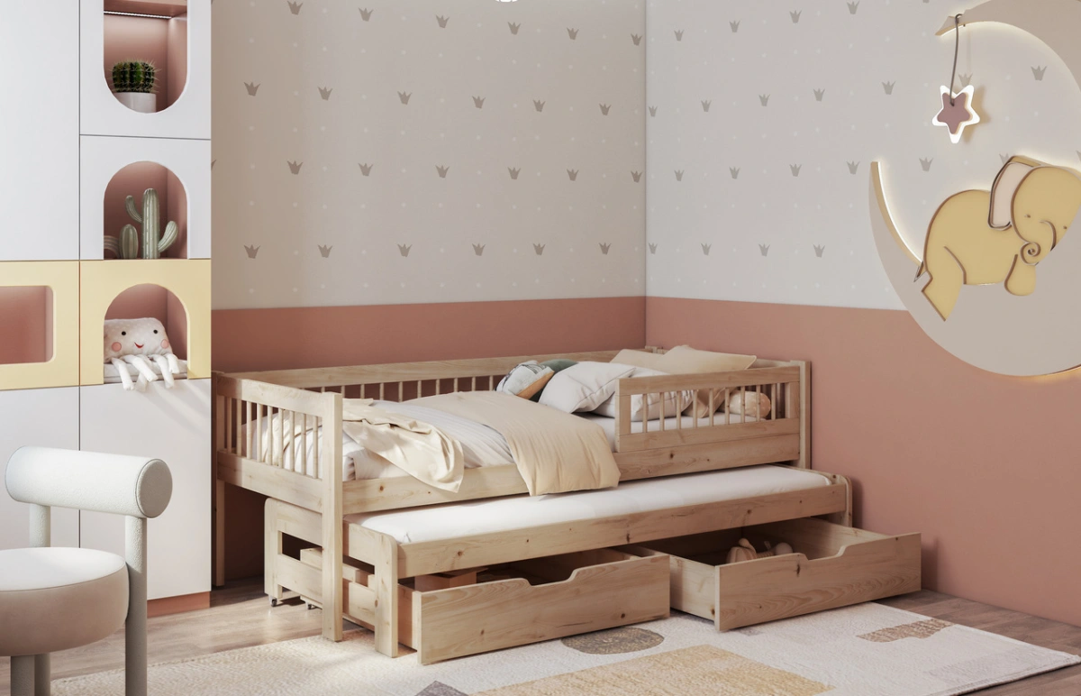 Dvivietė žema dviaukštė lova „Orion“ pagaminta iš pušies medienos, kuri kruopščiai tikrinama dėl patvarumo ir saugos savybių.