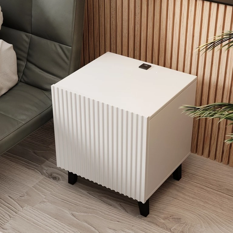 Šis elegantiškas ir funkcionalus baltas naktinis staliukas su frezuotu priekiu puikiai tiks bet kuriame miegamajame. Stilingos juodos kojelės suteikia modernumo, o viršuje įmontuotas USB įkroviklis leidžia patogiai įkrauti elektroninius prietaisus be papildomų laidų. Puikus dizaino ir praktiškumo derinys!