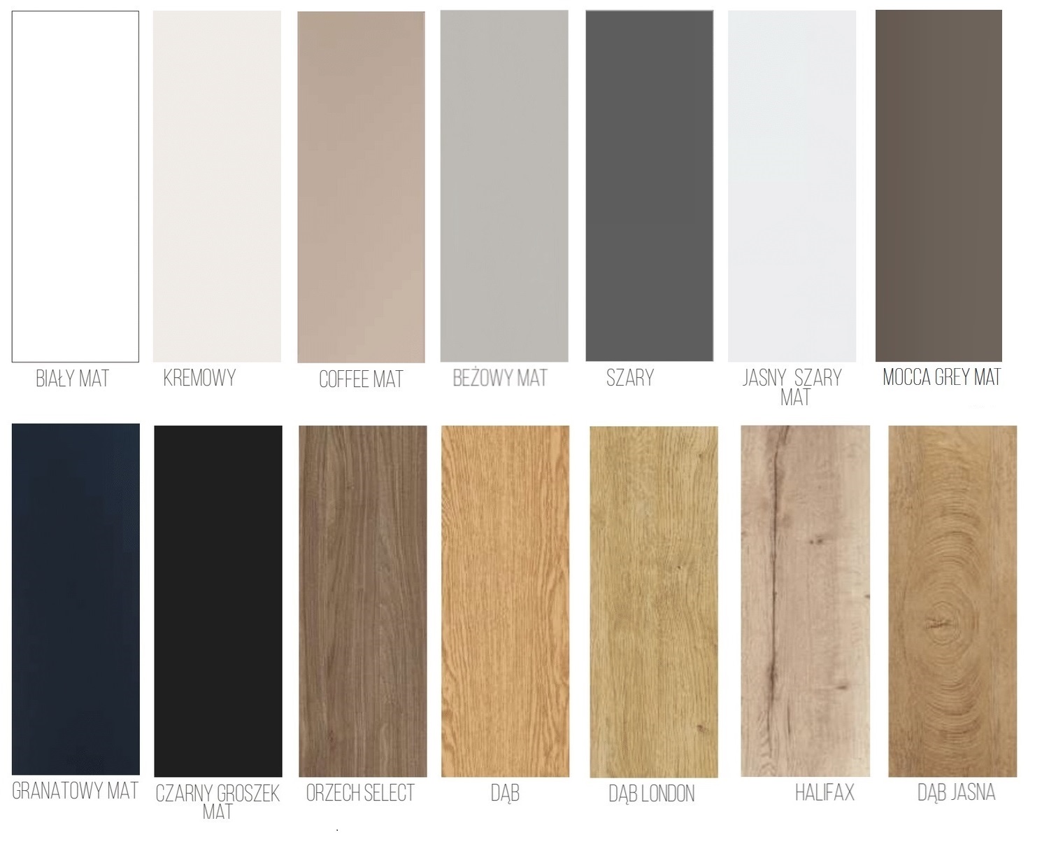 SPALVA: BALTA MATINĖ, JUODOJI ŽIRNIAI, ŠVIESIAI PILKA MATINĖ, PILKA MATINĖ, KAVOS MATINĖ, MOKA PILKA MATINĖ, MATINIS TAMSIAI MĖLYNAS, MATINIS KREMAS, MATINIS SMĖLIO SPALVOS, PASIRINKTA RIEŠUTMEDIS, LONDONO ĄŽUOLAS, HALIFAKSO ĄŽUOLAS, ĄŽUOLAS, ŠVIESUS TAIGOS ĄŽUOLAS