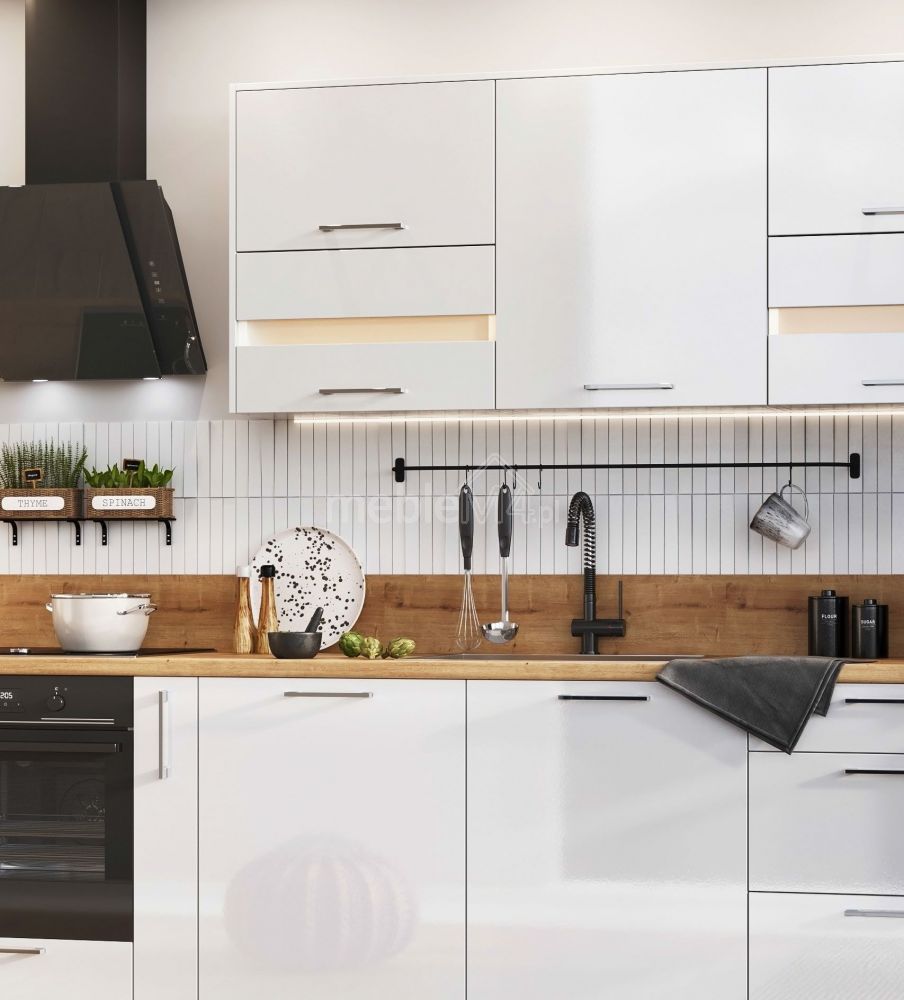 Viršutinių spintelių fasadų spalva: BALTA BLIZGĖ / KAŠMYRO BLIZGĖ