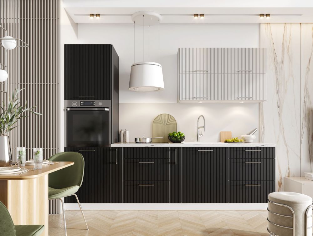 Virtuvės specifikacija – balti juodi žirneliai, šviesiai ir tamsiai pilka | Virtuvės stilius – modernus | Fasado tipas: Laminuota plokštė / MDF / Lakuota MDF plokštė | Matmenys: plotis [cm]>56,4 aukštis [cm]>203,3