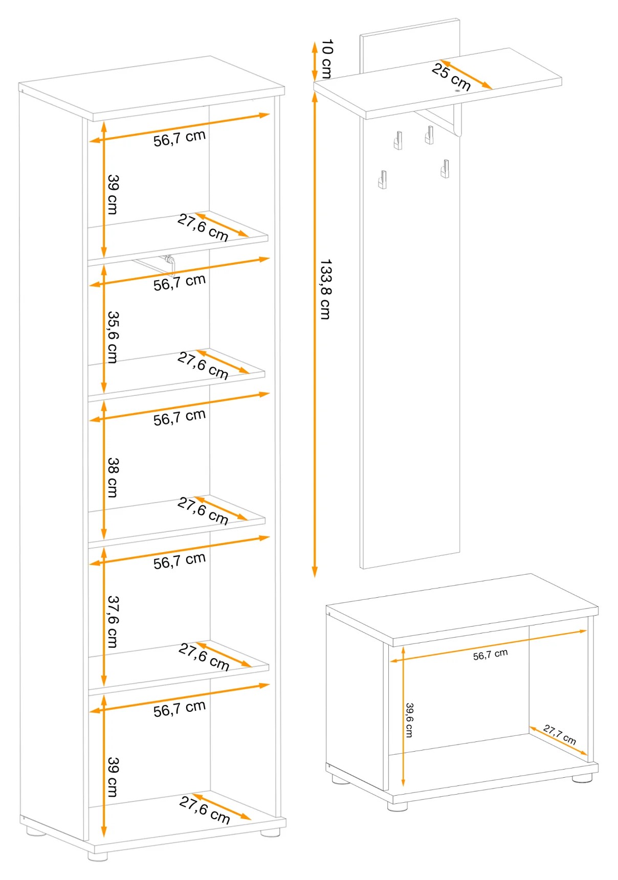Dvidurė spinta: kairėje pusėje durys su grotelėmis, 4 reguliuojamo aukščio lentynos ir drabužių pakaba viduje. Pakabinimo plokštė su lentyna apačioje, statmena pakaba ir 4 atskiri drabužių pakabos ant sienos. Laisvai stovinti spintelė: dvidurė spintelė (kairėje pusėje, priekis su grotelėmis), viduje skyrius. Pagalvėlė neįskaičiuota.