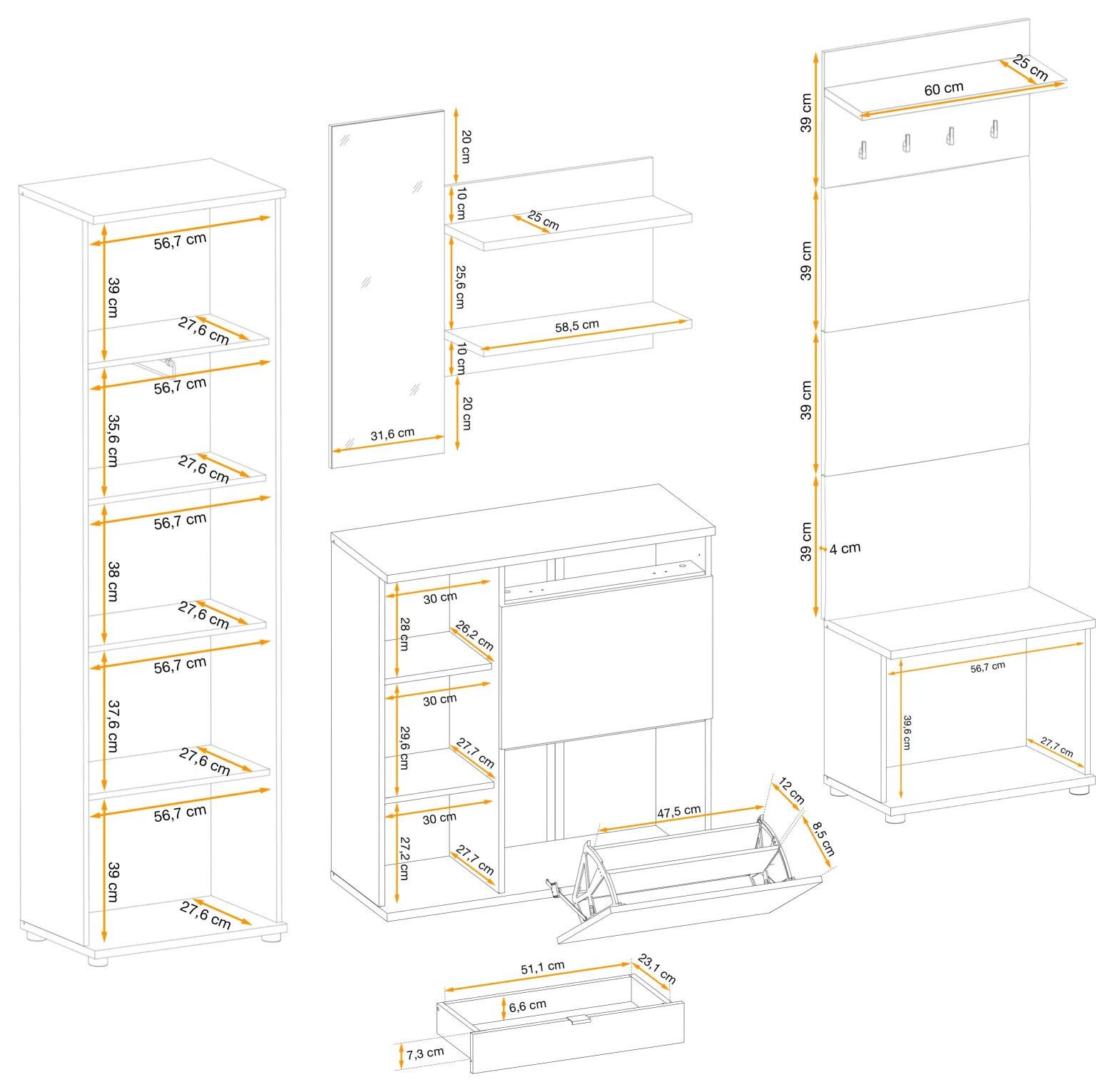 Dvidurė spinta: kairėje su grotelių durimis, viduje 4 reguliuojamo aukščio lentynos ir kabykla paltams. Sienos panelė su veidrodžiu ir lentynomis. Batų spintelė: kairėje su grotelių durimis, gale 2 standartinės lentynos, dešinėje stalčius ir apačioje 2 batų lentynos su varstomomis durimis. Apmušta panelė su lentyna ir 4 sieniniais kabliukais. Laisvai stovinti spintelė: dvidurė spintelė (priekyje grotelės kairėje), vidinis skyrius. Pagalvėlė neįskaičiuota.