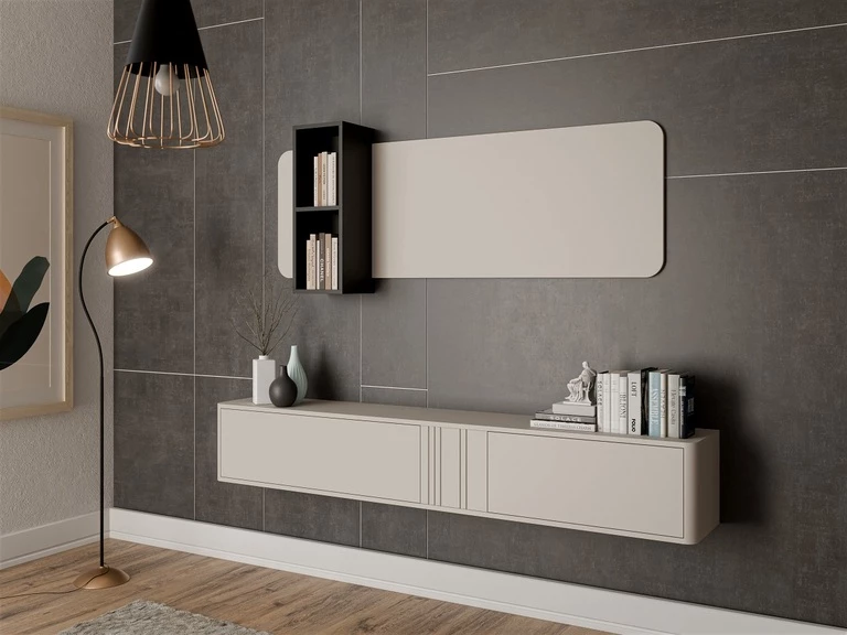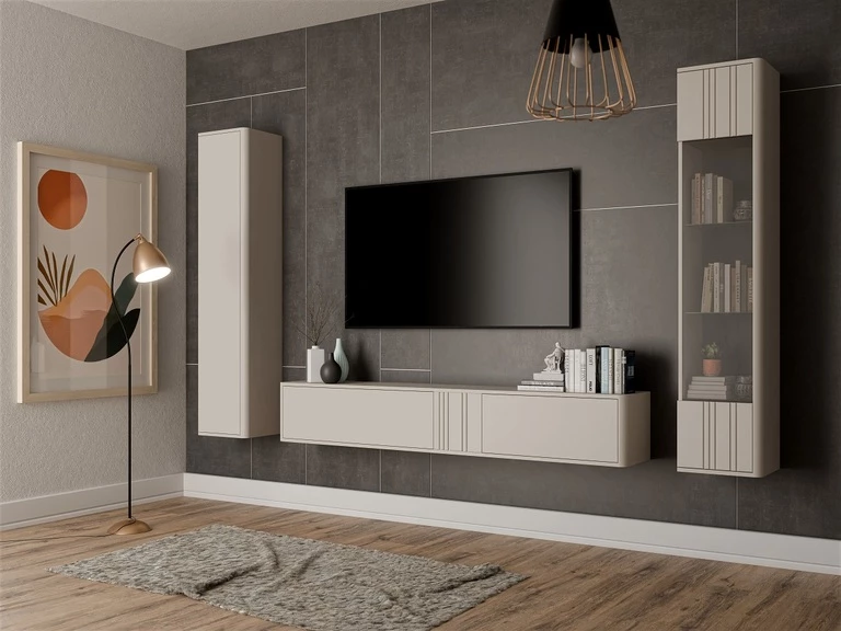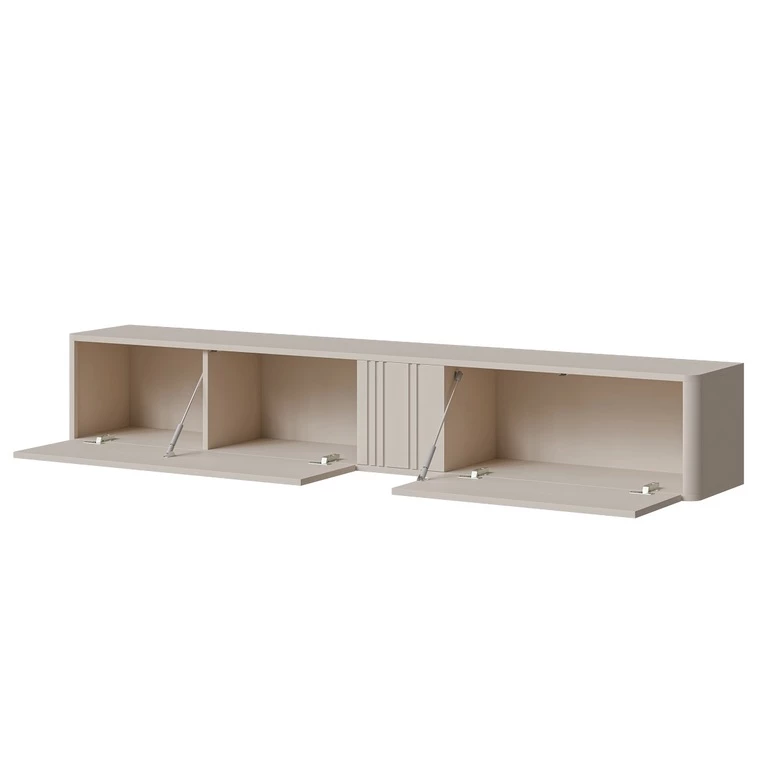 Šie baldai priklauso pakabinamų baldų kolekcijai, kuri sukuria šviesumo pojūtį kambaryje ir palengvina švaros palaikymą erdvėje. Atidarymo spustelėjus sistema panaikina rankenų poreikį, pabrėždama minimalistinį baldų charakterį. Visas baldas apdailintas elegantiška kašmyro spalva, kuri puikiai dera prie įvairių interjero dizainų. Pagrindinės savybės: