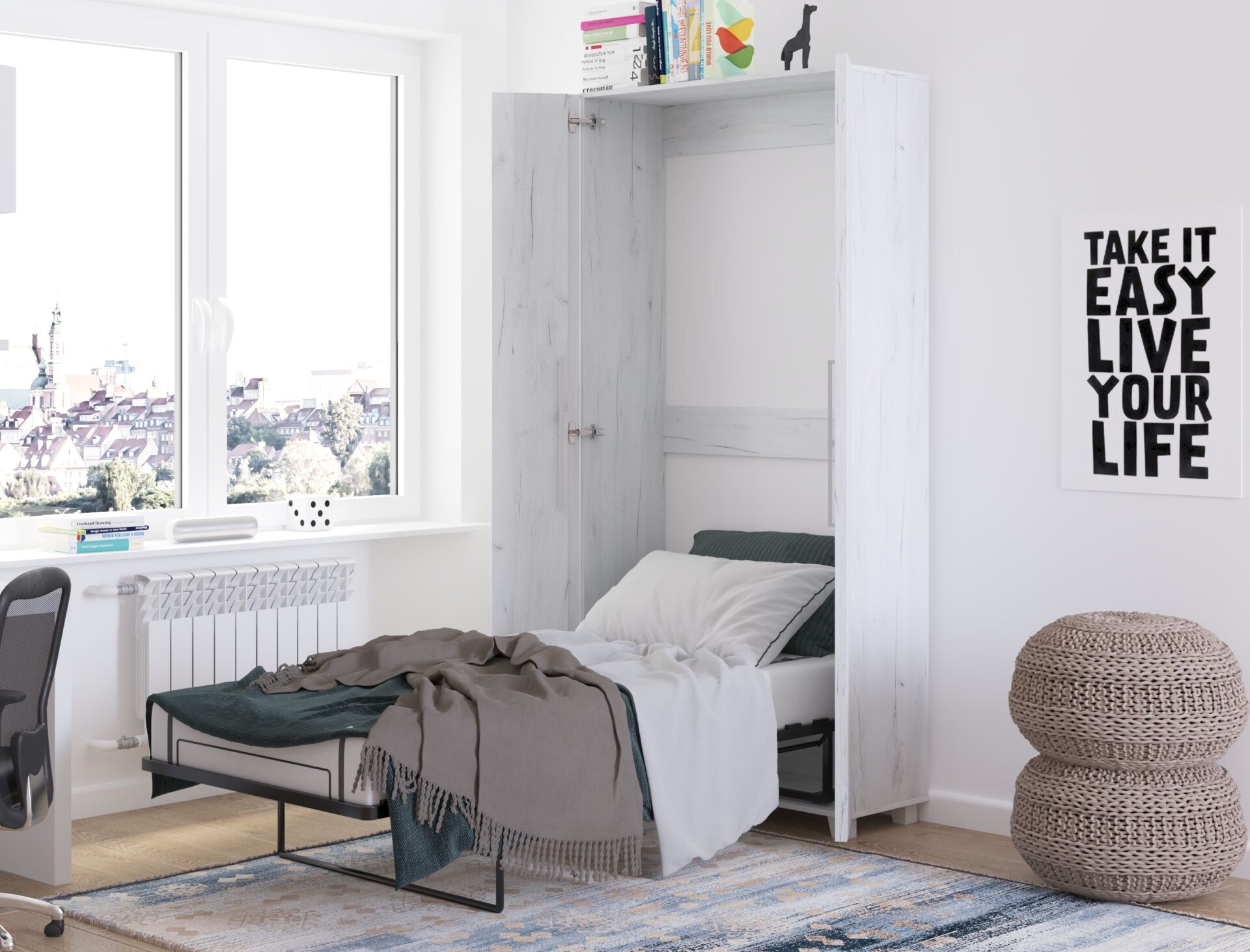 TEDDY sieninė lova be čiužinio – sieninė lova 90 cm, 16 mm plokštė, ABS kraštas, maksimalus čiužinio aukštis 15 cm, spalva: baltas ąžuolas