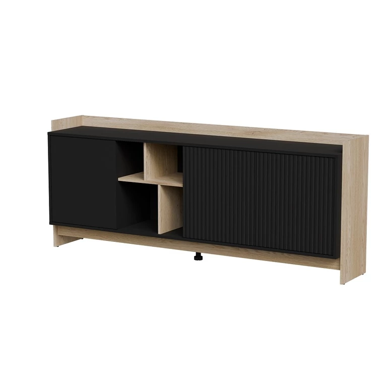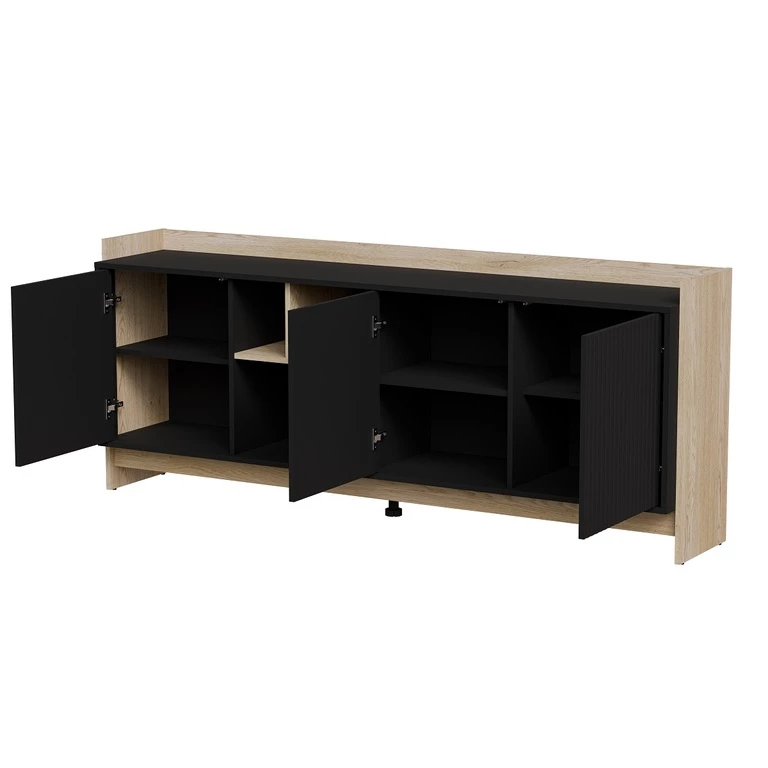 Juodi frezuoti svetainės baldai, derinami su Kremonos ąžuolu, yra stilingas ir modernus sprendimas. Frezuoti fasadai suteikia elegancijos ir unikalaus charakterio, o derinys su šiltu Kremonos ąžuolo atspalviu suteikia interjerui jaukumo ir natūralumo. Šie baldai puikiai tinka moderniam interjerui.