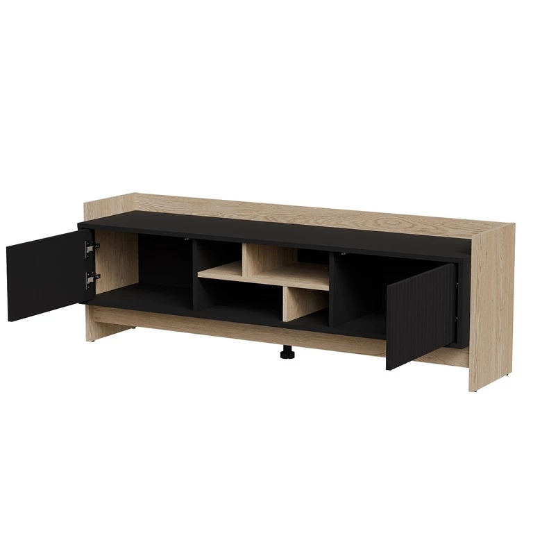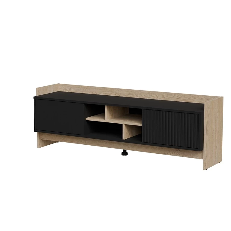 Juodi frezuoti svetainės baldai kartu su Kremonos ąžuolu – stilingas ir modernus sprendimas. Frezuoti fasadai suteikia elegancijos ir unikalaus charakterio, o derinys su šiltu Kremonos ąžuolo atspalviu suteikia interjerui jaukumo ir natūralumo. Šie baldai puikiai tinka moderniam interjerui.