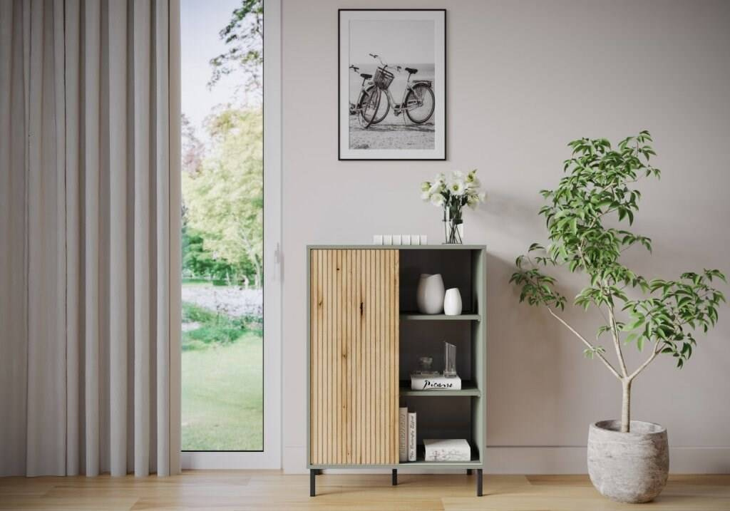 Būkite pirmas aprašęs “Pozzi POZK01 – pilkai žalia / pakrantės ąžuolo spalvos komoda su 1 durimis”