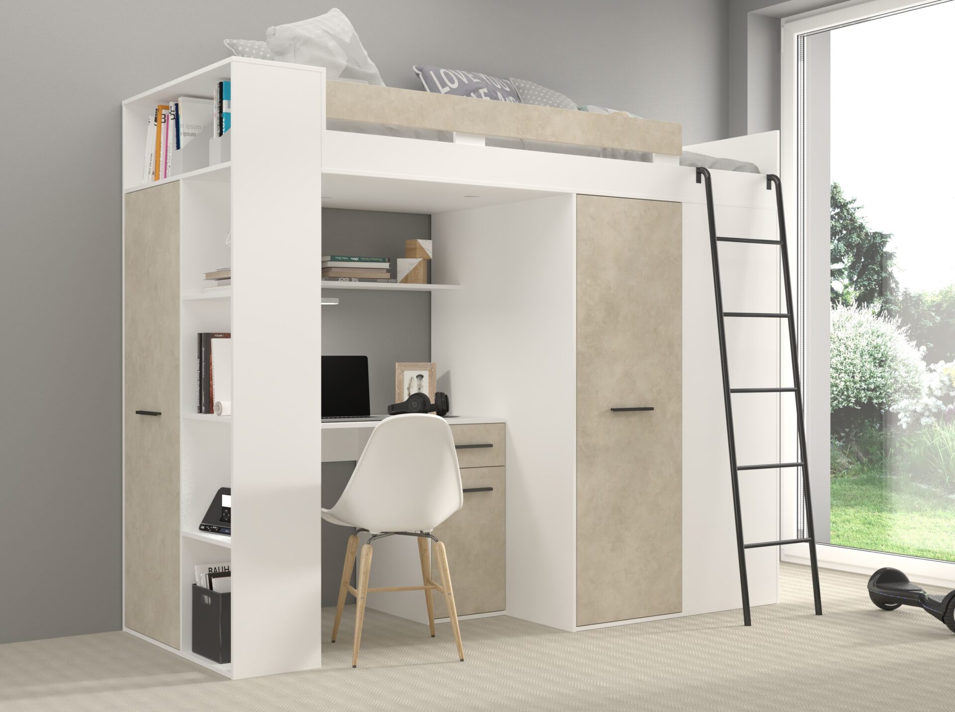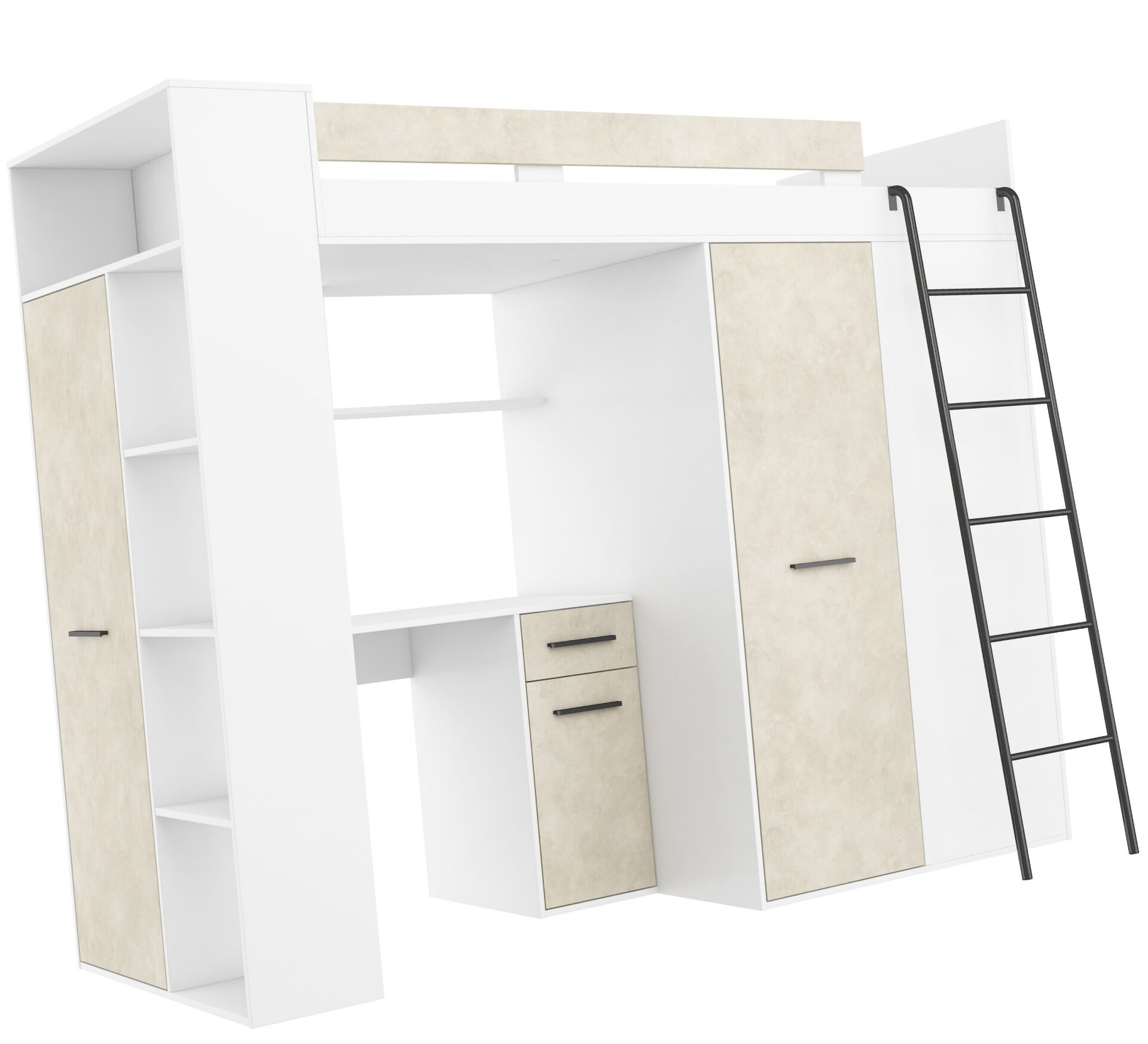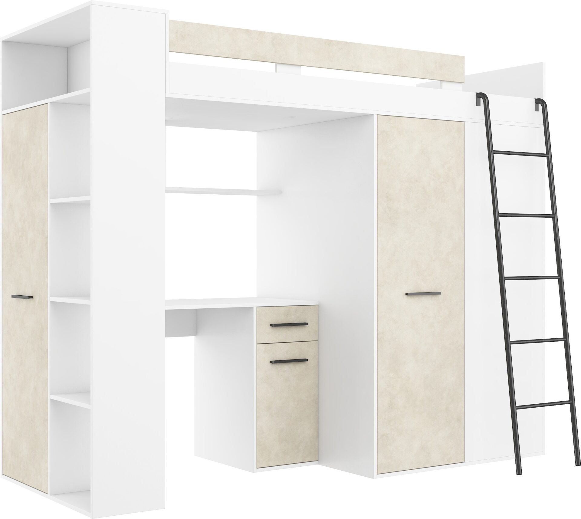 RAVENA P antresolė be čiužinio. 16 mm plokštė, ABS kraštas, švelnaus uždarymo sistema stalčiuose ir spintelėse. Spalva: balta / granados migdolų spalvos.